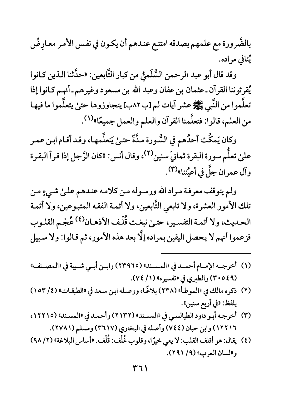 وقد قال أبو عبد الرحمن السُّلَميُّ من كبار التَّابعين: «حدَّثنا الذين كانوا يُقرئوننا القرآن ـ عثمان بن عفان وعبد الله بن مسعود وغيرهم ـ أنهم كانوا إذا تعلَّموا من النَّبي - صلى الله عليه وسلم - عشر آيات لم [ب ٨٢ ب] يتجاوزوها حتى يتعلَّموا ما فيها من العلم، قالوا: فتعلَّمنا القرآن والعلم والعمل جميعًا» (¬١).