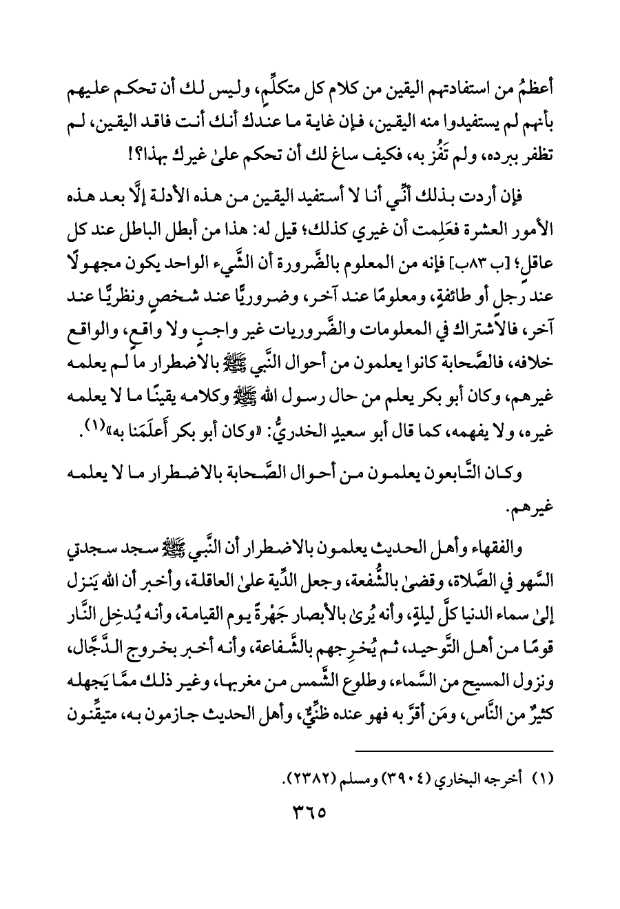 والفقهاء وأهل الحديث يعلمون بالاضطرار أن النَّبي - صلى الله عليه وسلم - سجد سجدتي السَّهو في الصَّلاة، وقضى بالشُّفعة، وجعل الدِّية على العاقلة، وأخبر أن الله يَنزل إلى سماء الدنيا كلَّ ليلةٍ، وأنه يُرى بالأبصار جَهْرةً يوم القيامة، وأنه يُدخِل النَّار قومًا من أهل التَّوحيد، ثم يُخرِجهم بالشَّفاعة، وأنه أخبر بخروج الدَّجَّال، ونزول المسيح من السَّماء، وطلوع الشَّمس من مغربها، وغير ذلك ممَّا يَجهله كثيرٌ من النَّاس، ومَن أقرَّ به فهو عنده ظنِّيٌّ، وأهل الحديث جازمون به، متيقِّنون