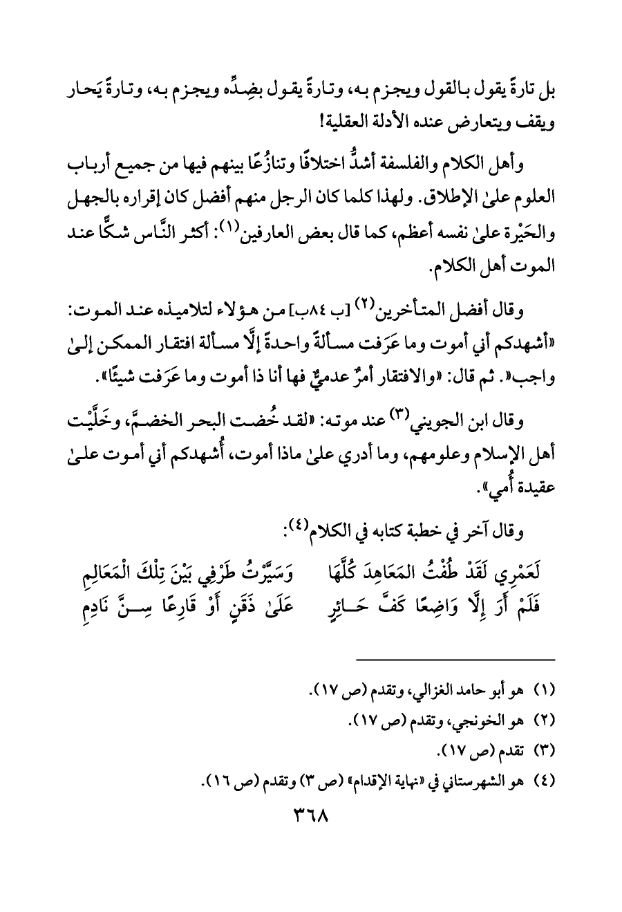 وقال أفضل المتأخرين (¬٢) [ب ٨٤ ب] من هؤلاء لتلاميذه عند الموت: «أشهدكم أني أموت وما عَرَفت مسألةً واحدةً إلَّا مسألة افتقار الممكن إلى واجب «. ثم قال: «والافتقار أمرٌ عدميٌّ فها أنا ذا أموت وما عَرَفت شيئًا».