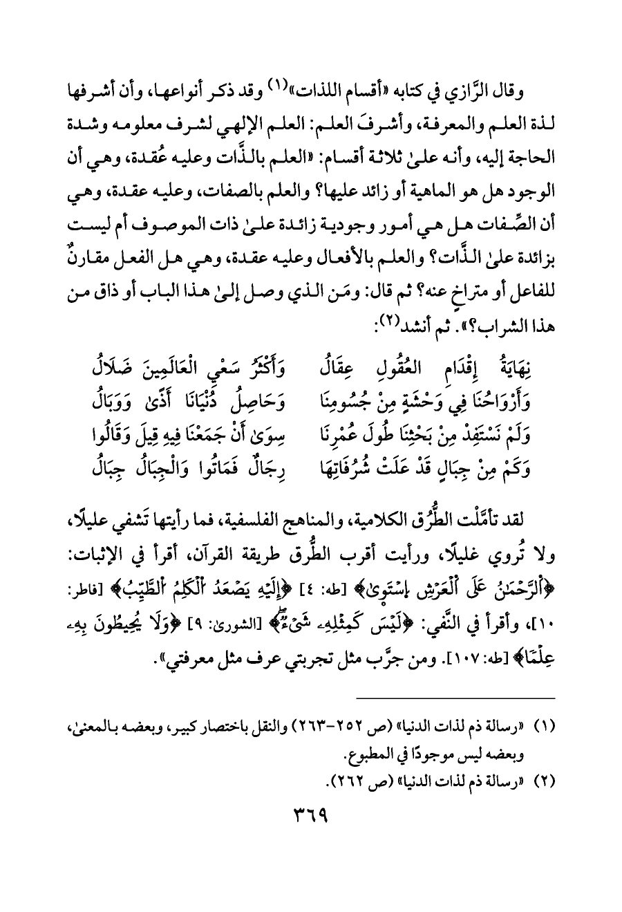 وقال الرَّازي في كتابه «أقسام اللذات» (¬١) وقد ذكر أنواعها، وأن أشرفها لذة العلم والمعرفة، وأشرفَ العلم: العلم الإلهي لشرف معلومه وشدة الحاجة إليه، وأنه على ثلاثة أقسام: «العلم بالذَّات وعليه عُقدة، وهي أن الوجود هل هو الماهية أو زائد عليها؟ والعلم بالصفات، وعليه عقدة، وهي أن الصِّفات هل هي أمور وجودية زائدة على ذات الموصوف أم ليست بزائدة على الذَّات؟ والعلم بالأفعال وعليه عقدة، وهي هل الفعل مقارنٌ للفاعل أو متراخٍ عنه؟ ثم قال: ومَن الذي وصل إلى هذا الباب أو ذاق من هذا الشراب؟». ثم أنشد (¬٢):