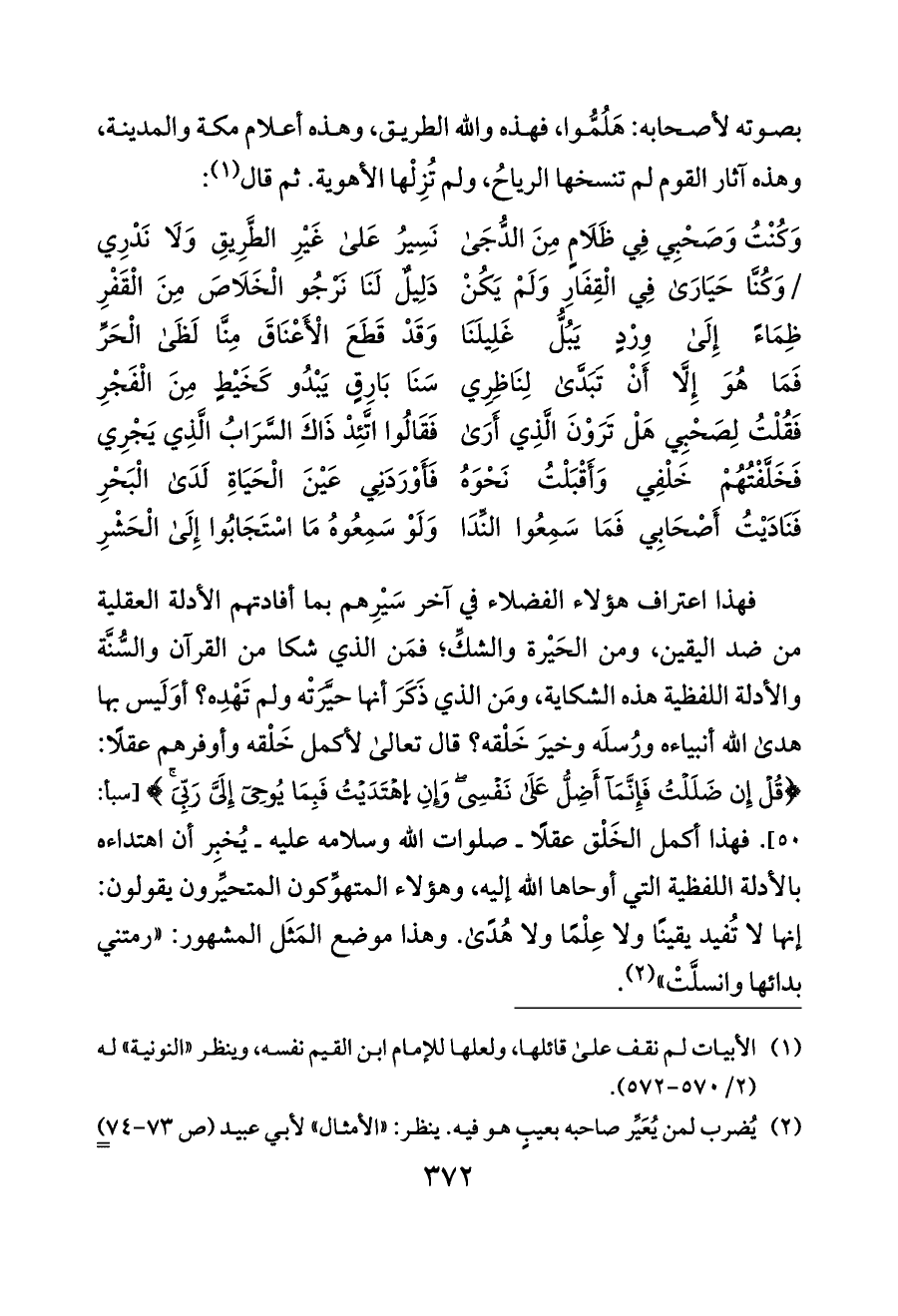 فهذا اعتراف هؤلاء الفضلاء في آخر سَيْرِهم بما أفادتهم الأدلة العقلية من ضد اليقين، ومن الحَيْرة والشكِّ؛ فمَن الذي شكا من القرآن والسُّنَّة والأدلة اللفظية هذه الشكاية، ومَن الذي ذَكَرَ أنها حيَّرَتْه ولم تَهْدِه؟ أوَلَيس بها هدى الله أنبياءه ورُسلَه وخيرَ خَلْقه؟ قال تعالى لأكمل خَلْقه وأوفرهم عقلًا: {قُلْ إِن ضَلَلْتُ فَإِنَّمَا أَضِلُّ عَلَى نَفْسِي وَإِنِ اِهْتَدَيْتُ فَبِمَا يُوحِي إِلَيَّ رَبِّيَ} [سبأ: ٥٠]. فهذا أكمل الخَلْق عقلًا ـ صلوات الله وسلامه عليه ـ يُخبِر أن اهتداءه بالأدلة اللفظية التي أوحاها الله إليه، وهؤلاء المتهوِّكون المتحيِّرون يقولون: إنها لا تُفيد يقينًا ولا عِلْمًا ولا هُدًى. وهذا موضع المَثَل المشهور: «رمتني بدائها وانسلَّتْ» (¬٢).