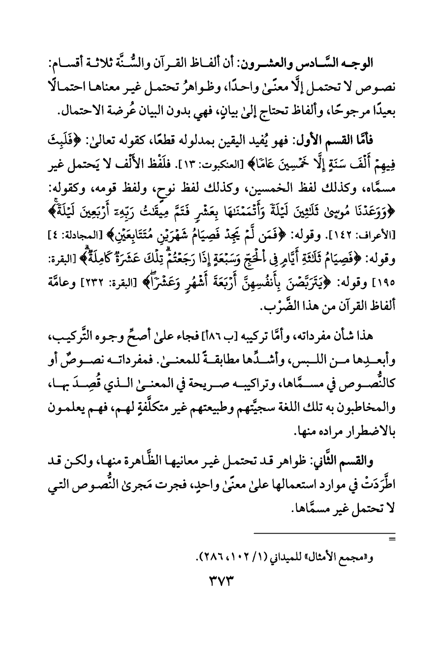 الوجه السَّادس والعشرون: أن ألفاظ القرآن والسُّنَّة ثلاثة أقسام: نصوص لا تحتمل إلَّا معنًى واحدًا، وظواهرُ تحتمل غير معناها احتمالًا بعيدًا مرجوحًا، وألفاظ تحتاج إلى بيانٍ، فهي بدون البيان عُرضة الاحتمال.