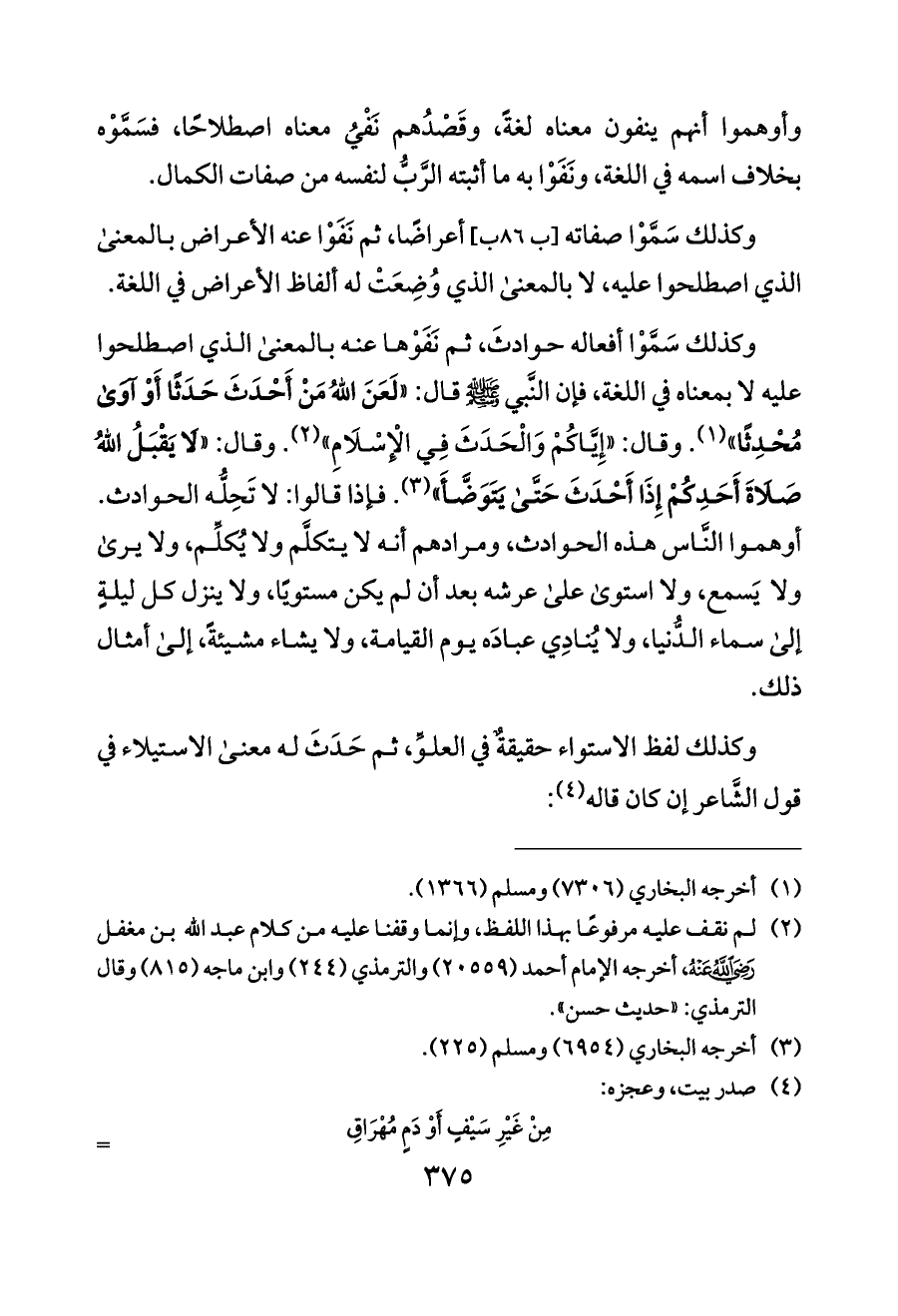 وكذلك سَمَّوْا أفعاله حوادثَ، ثم نَفَوْها عنه بالمعنى الذي اصطلحوا عليه لا بمعناه في اللغة، فإن النَّبي - صلى الله عليه وسلم - قال: «لَعَنَ اللهُ مَنْ أَحْدَثَ حَدَثًا أَوْ آوَى مُحْدِثًا» (¬١). وقال: «إِيَّاكُمْ وَالْحَدَثَ فِي الْإِسْلَامِ» (¬٢). وقال: «لَا يَقْبَلُ اللهُ صَلَاةَ أَحَدِكُمْ إِذَا أَحْدَثَ حَتَّى يَتَوَضَّأَ» (¬٣). فإذا قالوا: لا تَحِلُّه الحوادث. أوهموا النَّاس هذه الحوادث، ومرادهم أنه لا يتكلَّم ولا يُكلِّم، ولا يرى ولا يَسمع، ولا استوى على عرشه بعد أن لم يكن مستويًا، ولا ينزل كل ليلةٍ إلى سماء الدُّنيا، ولا يُنادِي عبادَه يوم القيامة، ولا يشاء مشيئةً، إلى أمثال ذلك.