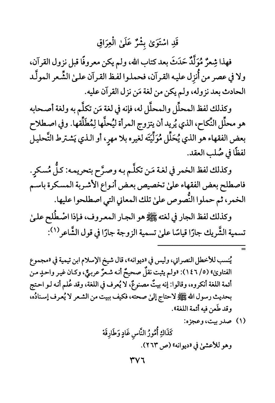فهذا شِعرٌ مُوَلَّدٌ حَدَثَ بعد كتاب الله، ولم يكن معروفًا قبل نزول القرآن، ولا في عصر من أُنزِل عليه القرآن، فحملوا لفظ القرآن على الشِّعر المولَّد الحادث بعد نزوله، ولم يكن من لغة مَن نزل القرآن عليه.