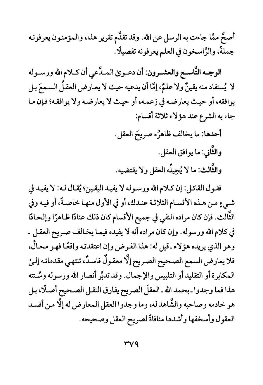 الوجه التَّاسع والعشرون: أن دعوى المدَّعي أن كلام الله ورسوله لا يُستفاد منه يقينٌ ولا علمٌ، إمَّا أن يدعيه حيث لا يعارض العقلُ السمعَ بل يوافقه، أو حيث يعارضه في زعمه، أو حيث لا يعارضه ولا يوافقه؛ فإن ما جاء به الشرع عند هؤلاء ثلاثة أقسام: