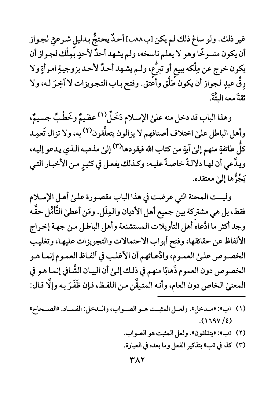 وليست المحنة التي عرضت في هذا الباب مقصورة على أهل الإسلام فقط، بل هي مشترِكة بين جميع أهل الأديان والمِلَل. ومَن أعطى التَّأمُّل حقَّه وجد أكثر ما ادَّعاه أهل التأويلات المستشنعة وأهل الباطل من جهة إخراج الألفاظ عن حقائقها، وفتح أبواب الاحتمالات والتجويزات عليها، وتغليب الخصوص على العموم، وادِّعائهم أن الأغلب في ألفاظ العموم إنما هو الخصوص دون العموم ذَهابًا منهم في ذلك إلى أن البيان الشَّافي إنما هو في المعنى الخاص دون العام، وأنه المتيقَّن من اللفظ، فإن ظَفَرَ به وإلَّا قال: