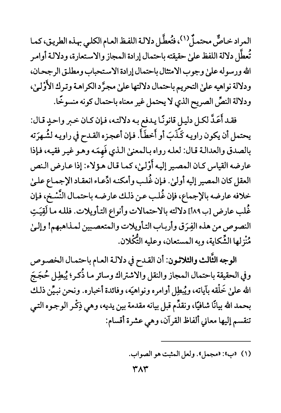 الوجه الثَّالث والثلاثون: أن القدح في دلالة العام باحتمال الخصوص وفي الحقيقة باحتمال المجاز والنقل والاشتراك وسائر ما ذُكر؛ يُبطِل حُجَجَ الله على خَلْقه بآياته، ويُبطِل أوامره ونواهيَه، وفائدة أخباره. ونحن نبيِّن ذلك بحمد الله بيانًا شافيًا، ونقدِّم قبل بيانه مقدمة بين يديه، وهي ذِكْر الوجوه التي تنقسم إليها معاني ألفاظ القرآن، وهي عشرة أقسام: