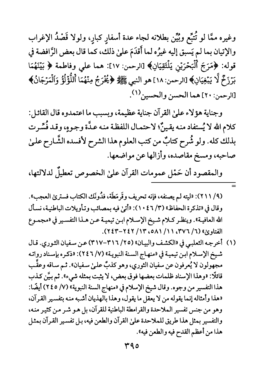 وغيره ممَّا لو تُتبِّع وبُيِّن بطلانه لجاء عدة أسفارٍ كبارٍ، ولولا قَصْدُ الإغراب والإتيان بما لم يَسبق إليه غيرُه لما أَقدَمَ على ذلك، كما قال بعض الرَّافضة في قوله: {مَرَجَ اَلْبَحْرَيْنِ يَلْتَقِيَانِ} [الرحمن: ١٧]: هما علي وفاطمة {بَيْنَهُمَا بَرْزَخٌ لَّا يَبْغِيَانِ} [الرحمن: ١٨] هو النبي - صلى الله عليه وسلم - {يُخْرَجُ مِنْهُمَا اَللُّؤْلُؤُ وَاَلْمَرْجَانُ} [الرحمن: ٢٠] هما الحسن والحسين (¬١).