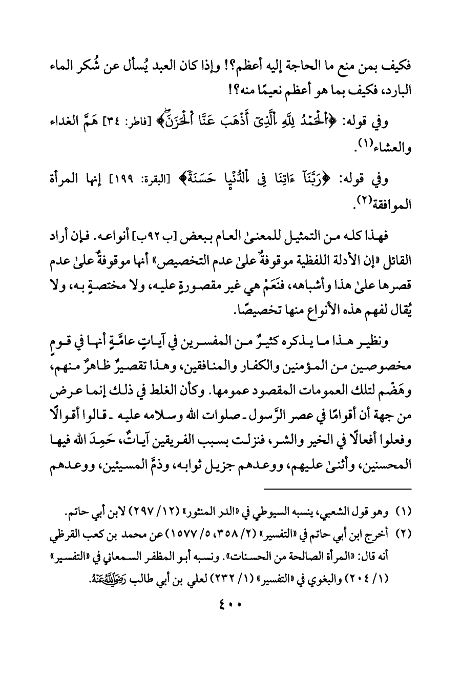 ونظير هذا ما يذكره كثيرٌ من المفسرين في آياتٍ عامَّةٍ أنها في قومٍ مخصوصين من المؤمنين والكفار والمنافقين، وهذا تقصيرٌ ظاهرٌ منهم، وهَضْم لتلك العمومات المقصود عمومها. وكأن الغلط في ذلك إنما عرض من جهة أن أقوامًا في عصر الرَّسول ـ صلوات الله وسلامه عليه ـ قالوا أقوالًا وفعلوا أفعالًا في الخير والشر، فنزلت بسبب الفريقين آياتٌ، حَمِدَ الله فيها المحسنين، وأثنى عليهم، ووعدهم جزيل ثوابه، وذمَّ المسيئين، ووعدهم