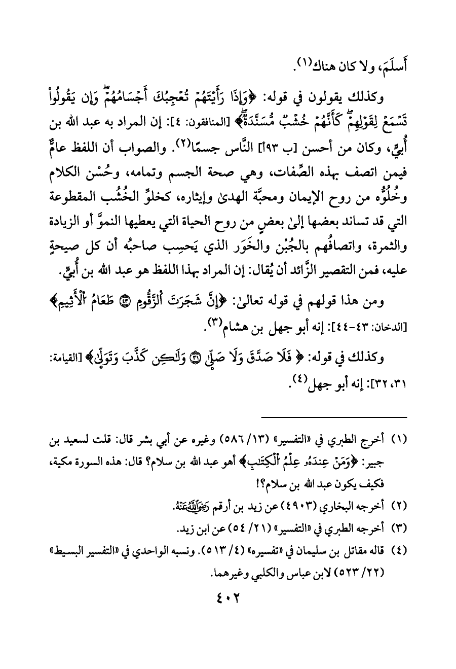 وكذلك يقولون في قوله: {وَإِذَا رَأَيْتَهُمْ تُعْجِبُكَ أَجْسَامُهُمْ وَإِن يَقُولُوا تَسْمَعْ لِقَوْلِهِمْ كَأَنَّهُمْ خُشْبٌ مُّسَنَّدَةٌ} [المنافقون: ٤]: إن المراد به عبد الله بن أُبيٍّ، وكان من أحسن [ب ٩٣ أ] النَّاس جسمًا (¬٢). والصواب أن اللفظ عامٌّ فيمن اتصف بهذه الصِّفات، وهي صحة الجسم وتمامه، وحُسْن الكلام وخُلُوُّه من روح الإيمان ومحبَّة الهدى وإيثاره، كخلوِّ الخُشُب المقطوعة التي قد تساند بعضها إلى بعضٍ من روح الحياة التي يعطيها النموَّ أو الزيادة والثمرة، واتصافُهم بالجُبْن والخَوَر الذي يَحسِب صاحبُه أن كل صيحةٍ عليه، فمن التقصير الزَّائد أن يُقال: إن المراد بهذا اللفظ هو عبد الله بن أُبيٍّ.