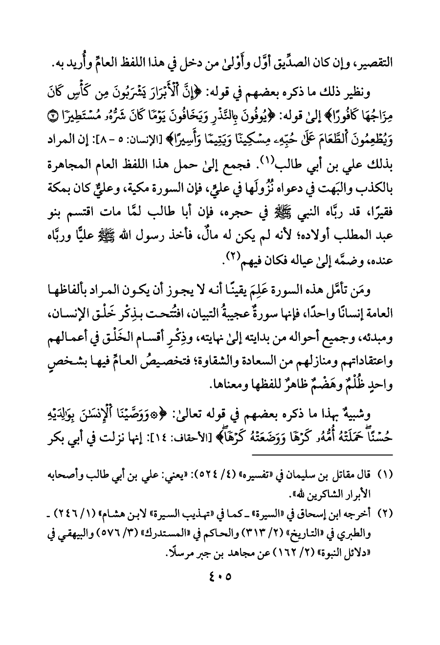 ونظير ذلك ما ذكره بعضهم في قوله: {إِنَّ اَلْأَبْرَارَ يَشْرَبُونَ مِن كَأْسٍ كَانَ مِزَاجُهَا كَافُورًا} إلى قوله: {يُوفُونَ بِالنَّذْرِ وَيَخَافُونَ يَوْمًا كَانَ شَرُّهُ مُسْتَطِيرًا (٧) وَيُطْعِمُونَ اَلطَّعَامَ عَلَى حُبِّهِ مِسْكِينًا وَيَتِيمًا وَأَسِيرًا} [الإنسان: ٥ - ٨]: إن المراد بذلك علي بن أبي طالب (¬١). فجمع إلى حمل هذا اللفظ العام المجاهرة بالكذب والبَهت في دعواه نُزُولَها في عليٍّ، فإن السورة مكية، وعليٌّ كان بمكة فقيرًا، قد ربَّاه النبي - صلى الله عليه وسلم - في حجره، فإن أبا طالب لمَّا مات اقتسم بنو عبد المطلب أولاده؛ لأنه لم يكن له مالٌ، فأخذ رسول الله - صلى الله عليه وسلم - عليًّا وربَّاه عنده، وضمَّه إلى عياله فكان فيهم (¬٢).