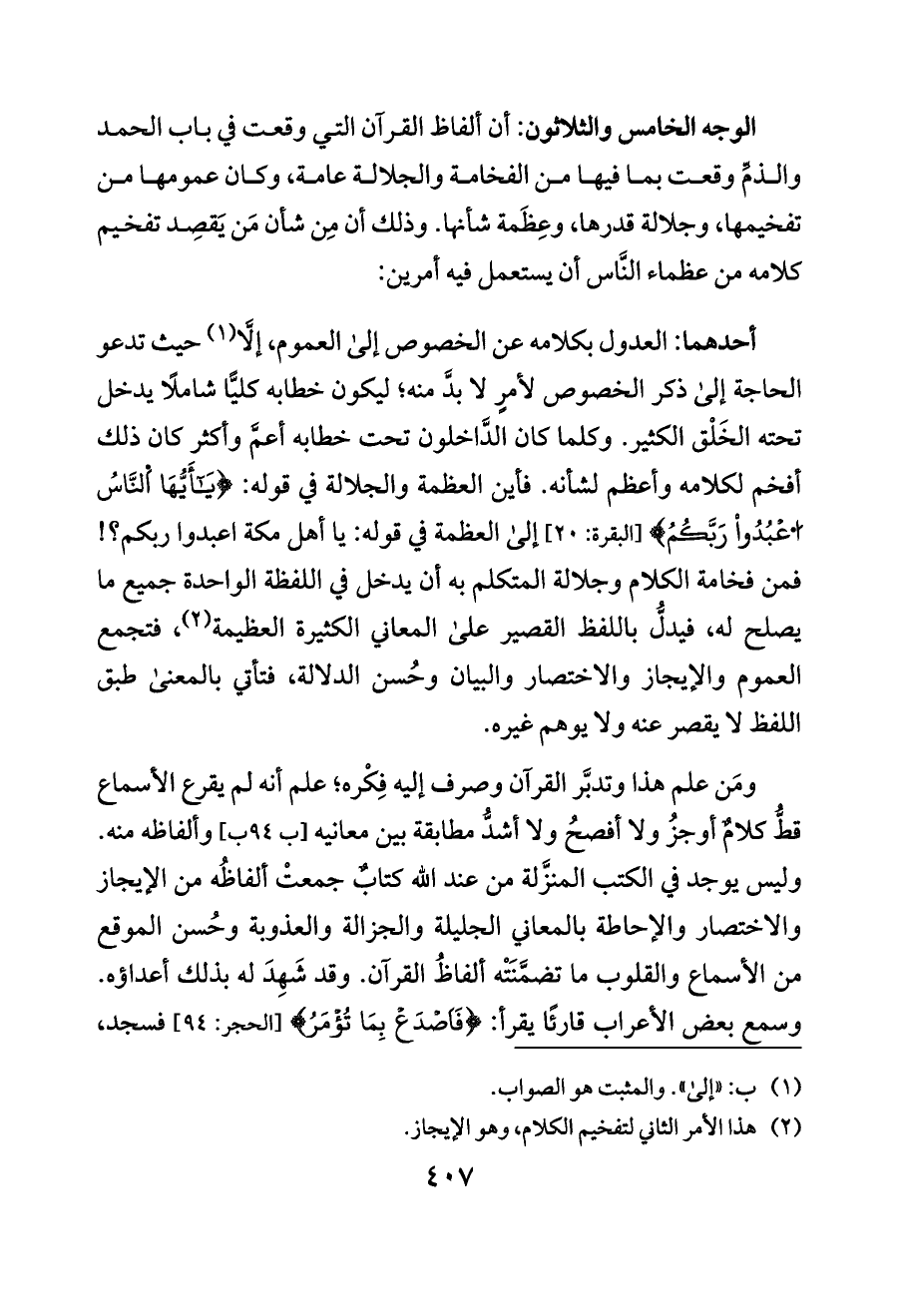 الوجه الخامس والثلاثون: أن ألفاظ القرآن التي وقعت في باب الحمد والذمِّ وقعت بما فيها من الفخامة والجلالة عامة، وكان عمومها من تفخيمها، وجلالة قدرها، وعِظَمة شأنها. وذلك أن مِن شأن مَن يَقصِد تفخيم كلامه من عظماء النَّاس أن يستعمل فيه أمرين: