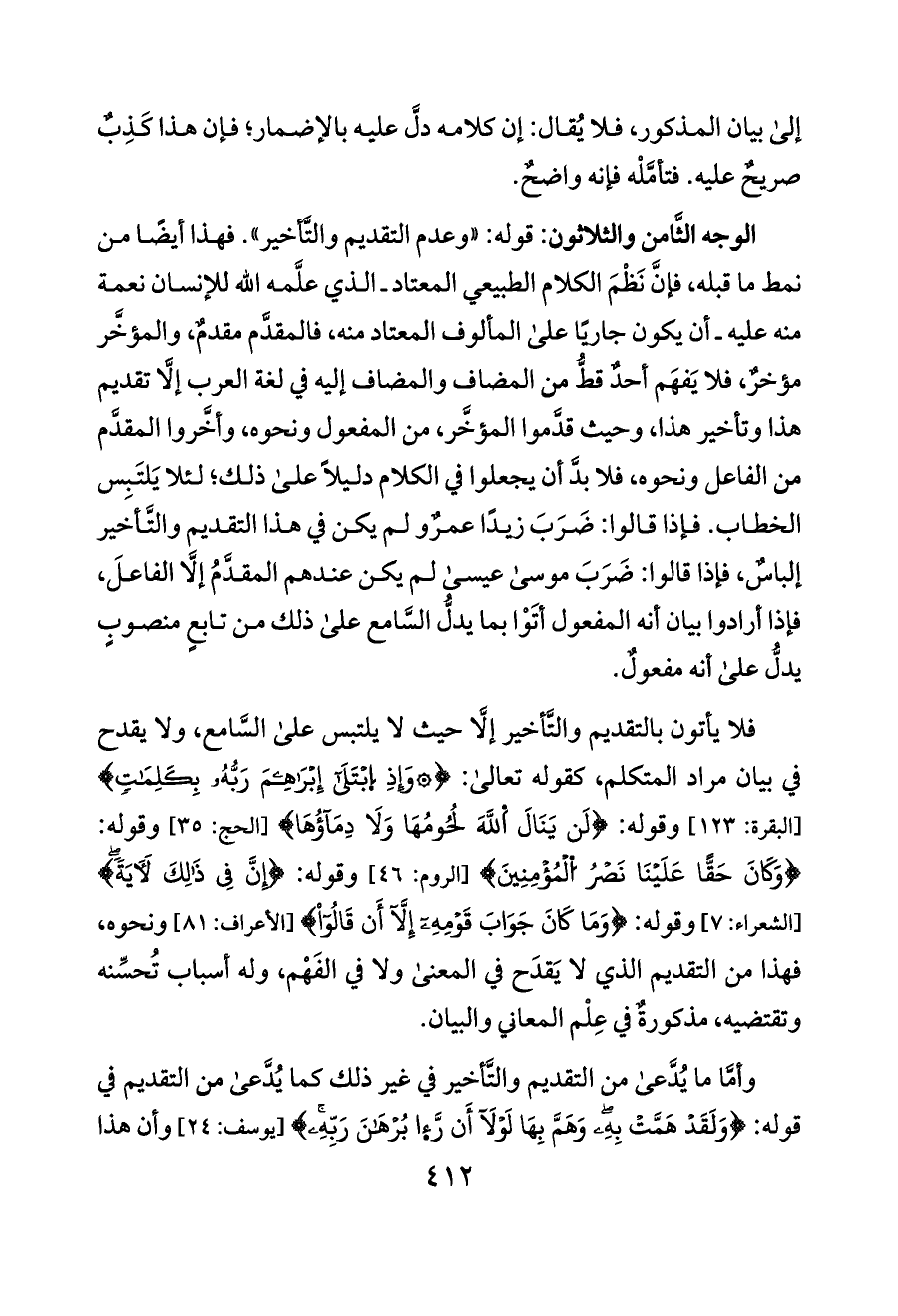فلا يأتون بالتقديم والتَّأخير إلَّا حيث لا يلتبس على السَّامع، ولا يقدح في بيان مراد المتكلم، كقوله تعالى: {* وَإِذِ اِبْتَلَى إِبْرَاهِيمَ رَبُّهُ بِكَلِمَاتٍ} [البقرة: ١٢٣] وقوله: {لَن يَنَالَ اَللَّهَ لُحُومُهَا وَلَا دِمَاؤُهَا} [الحج: ٣٥] وقوله: {وَكَانَ حَقًّا عَلَيْنَا نَصْرُ اُلْمُؤْمِنِينَ} [الروم: ٤٦] وقوله: {إِنَّ فِي ذَلِكَ لَأيَةً} [الشعراء: ٧] وقوله: {وَمَا كَانَ جَوَابَ قَوْمِهِ إِلَّا أَن قَالُوا} [الأعراف: ٨١] ونحوه، فهذا من التقديم الذي لا يَقدَح في المعنى ولا في الفَهْم، وله أسباب تُحسِّنه وتقتضيه، مذكورةٌ في عِلْم المعاني والبيان.