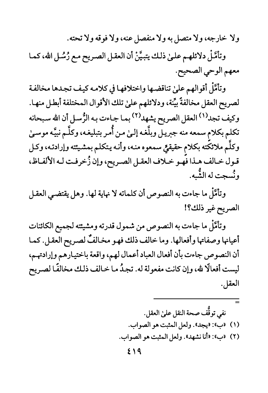 وتأمَّلْ دلائلهم على ذلك يتبيَّنْ أن العقل الصريح مع رُسُل الله، كما معهم الوحي الصحيح.