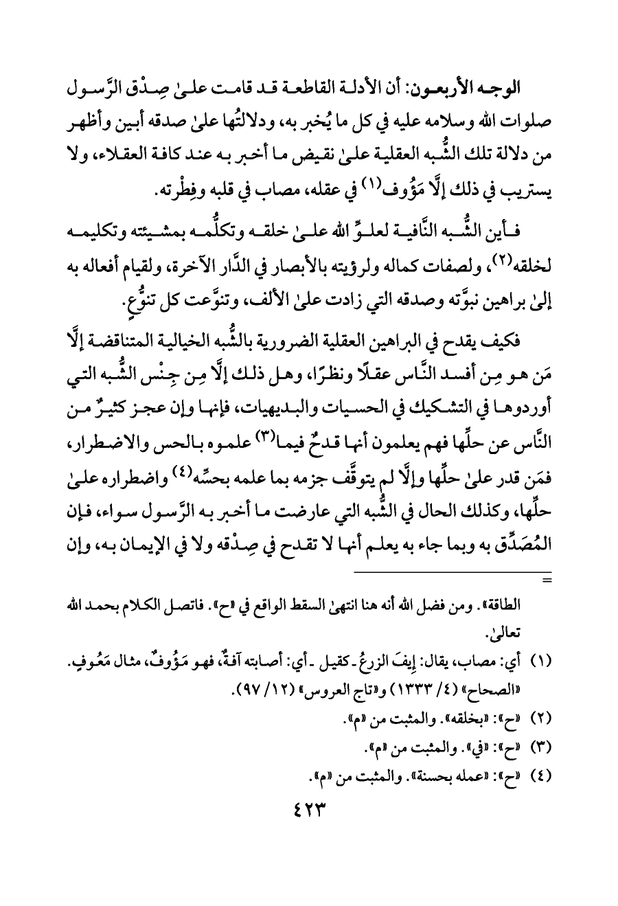 الوجه الأربعون: أن الأدلة القاطعة قد قامت على صِدْق الرَّسول صلوات الله وسلامه عليه في كل ما يُخبر به، ودلالتُها على صدقه أبين وأظهر من دلالة تلك الشُّبه العقلية على نقيض ما أخبر به عند كافة العقلاء، ولا يستريب في ذلك إلَّا مَؤُوف (¬١) في عقله، مصاب في قلبه وفِطْرته.