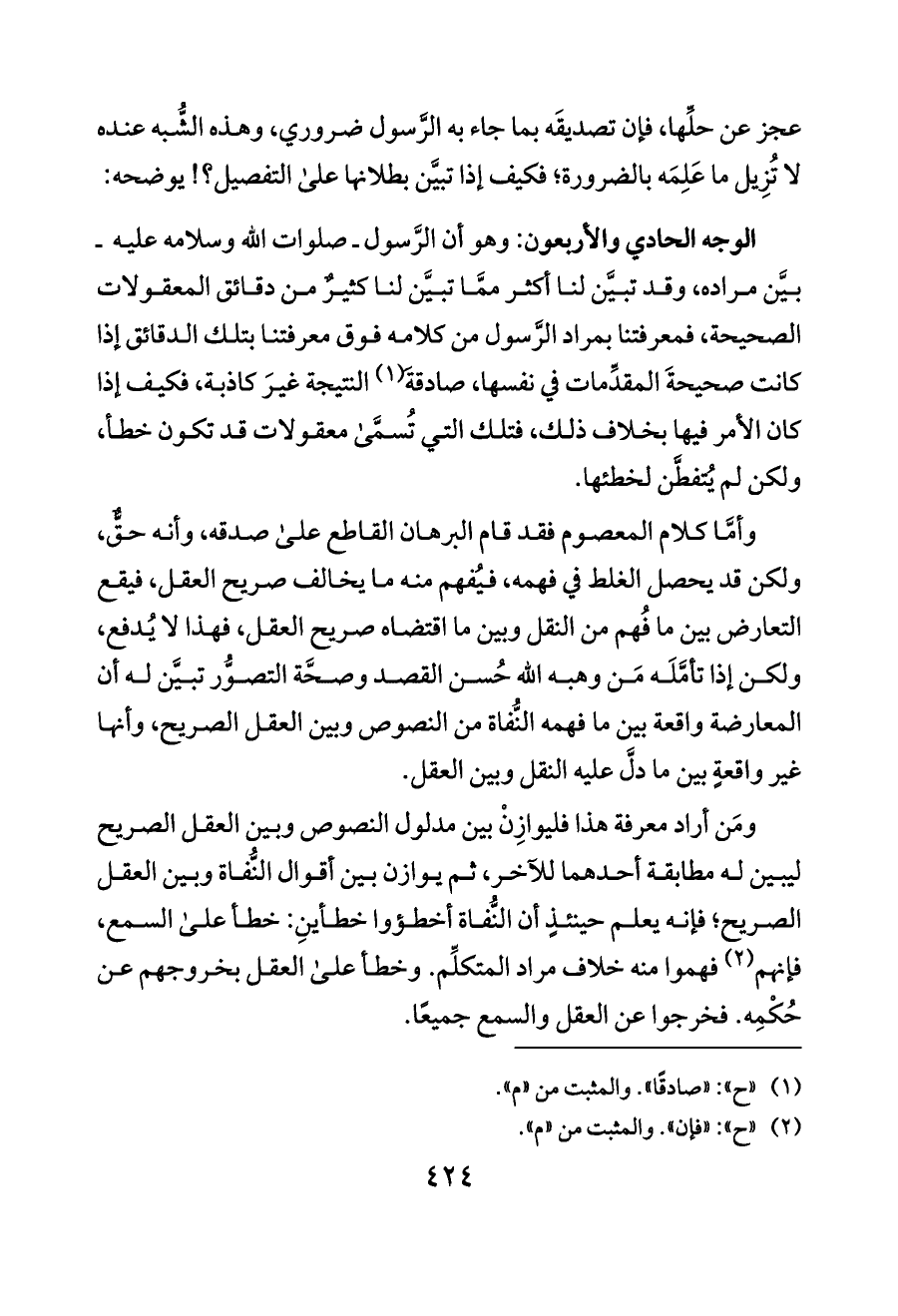 الوجه الحادي والأربعون: وهو أن الرَّسول ـ صلوات الله وسلامه عليه ـ بيَّن مراده، وقد تبيَّن لنا أكثر ممَّا تبيَّن لنا كثيرٌ من دقائق المعقولات الصحيحة، فمعرفتنا بمراد الرَّسول من كلامه فوق معرفتنا بتلك الدقائق إذا كانت صحيحةَ المقدِّمات في نفسها، صادقةَ (¬١) النتيجة غيرَ كاذبة، فكيف إذا كان الأمر فيها بخلاف ذلك، فتلك التي تُسمَّى معقولات قد تكون خطأ، ولكن لم يُتفطَّن لخطئها.