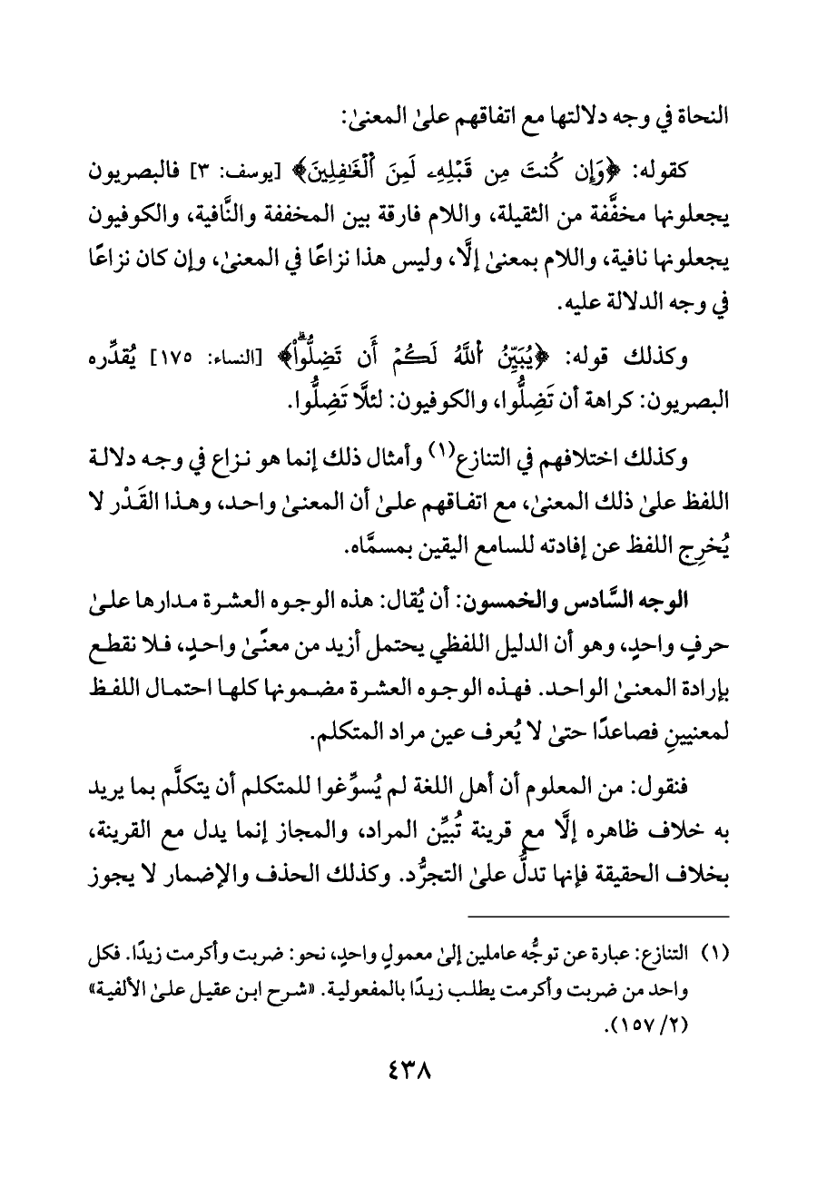 (¬١) التنازع: عبارة عن توجُّه عاملين إلى معمولٍ واحدٍ، نحو: ضربت وأكرمت زيدًا. فكل واحد من ضربت وأكرمت يطلب زيدًا بالمفعولية. «شرح ابن عقيل على الألفية» (٢/ ١٥٧).