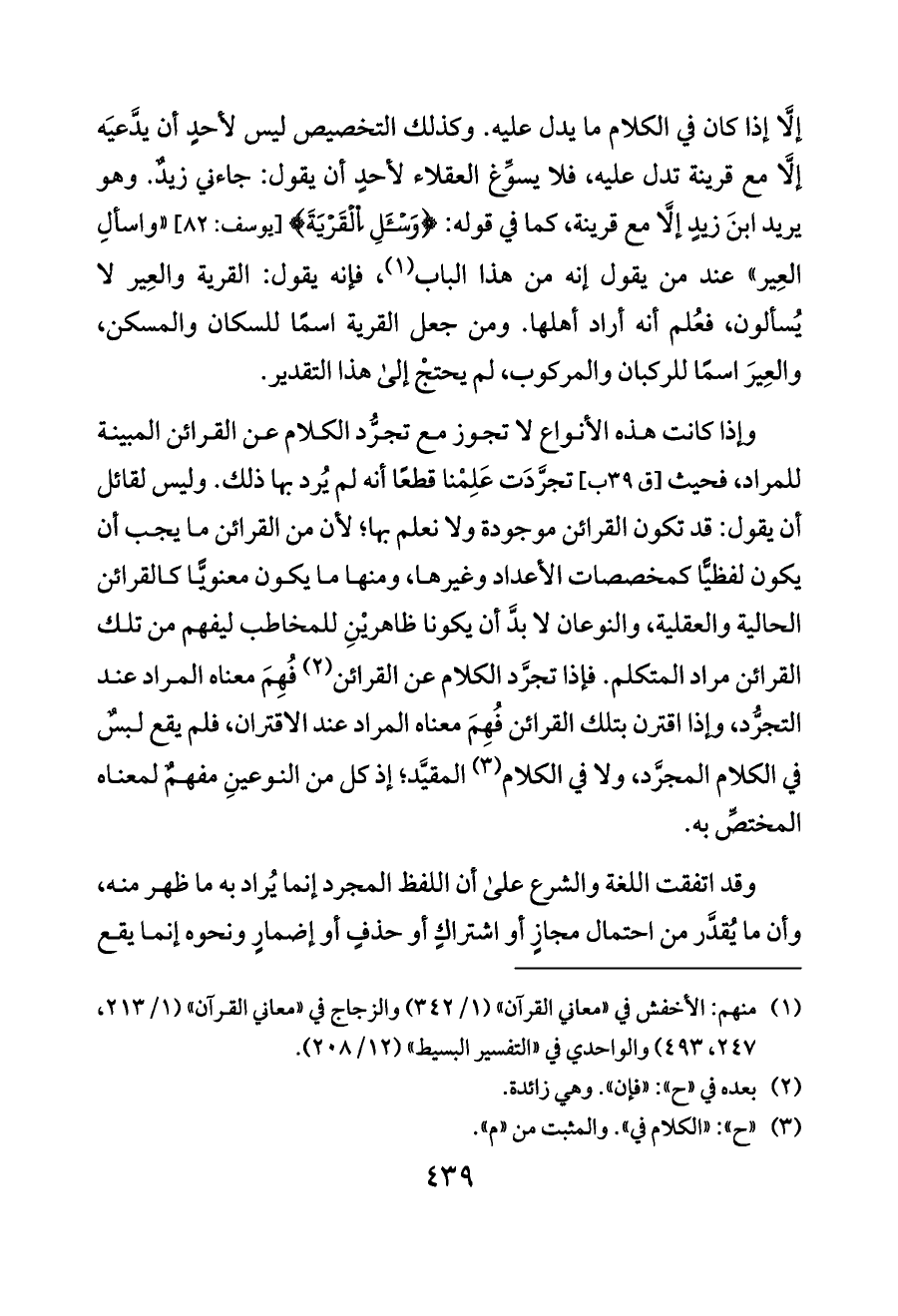 وإذا كانت هذه الأنواع لا تجوز مع تجرُّد الكلام عن القرائن المبينة للمراد، فحيث [ق ٣٩ ب] تجرَّدَت عَلِمْنا قطعًا أنه لم يُرد بها ذلك. وليس لقائل أن يقول: قد تكون القرائن موجودة ولا نعلم بها؛ لأن من القرائن ما يجب أن يكون لفظيًّا كمخصصات الأعداد وغيرها، ومنها ما يكون معنويًّا كالقرائن الحالية والعقلية، والنوعان لا بدَّ أن يكونا ظاهريْنِ للمخاطب ليفهم من تلك القرائن مراد المتكلم. فإذا تجرَّد الكلام عن القرائن (¬٢) فُهِمَ معناه المراد عند التجرُّد، وإذا اقترن بتلك القرائن فُهِمَ معناه المراد عند الاقتران، فلم يقع لبسٌ في الكلام المجرَّد، ولا في الكلام (¬٣) المقيَّد؛ إذ كل من النوعينِ مفهمٌ لمعناه المختصِّ به.