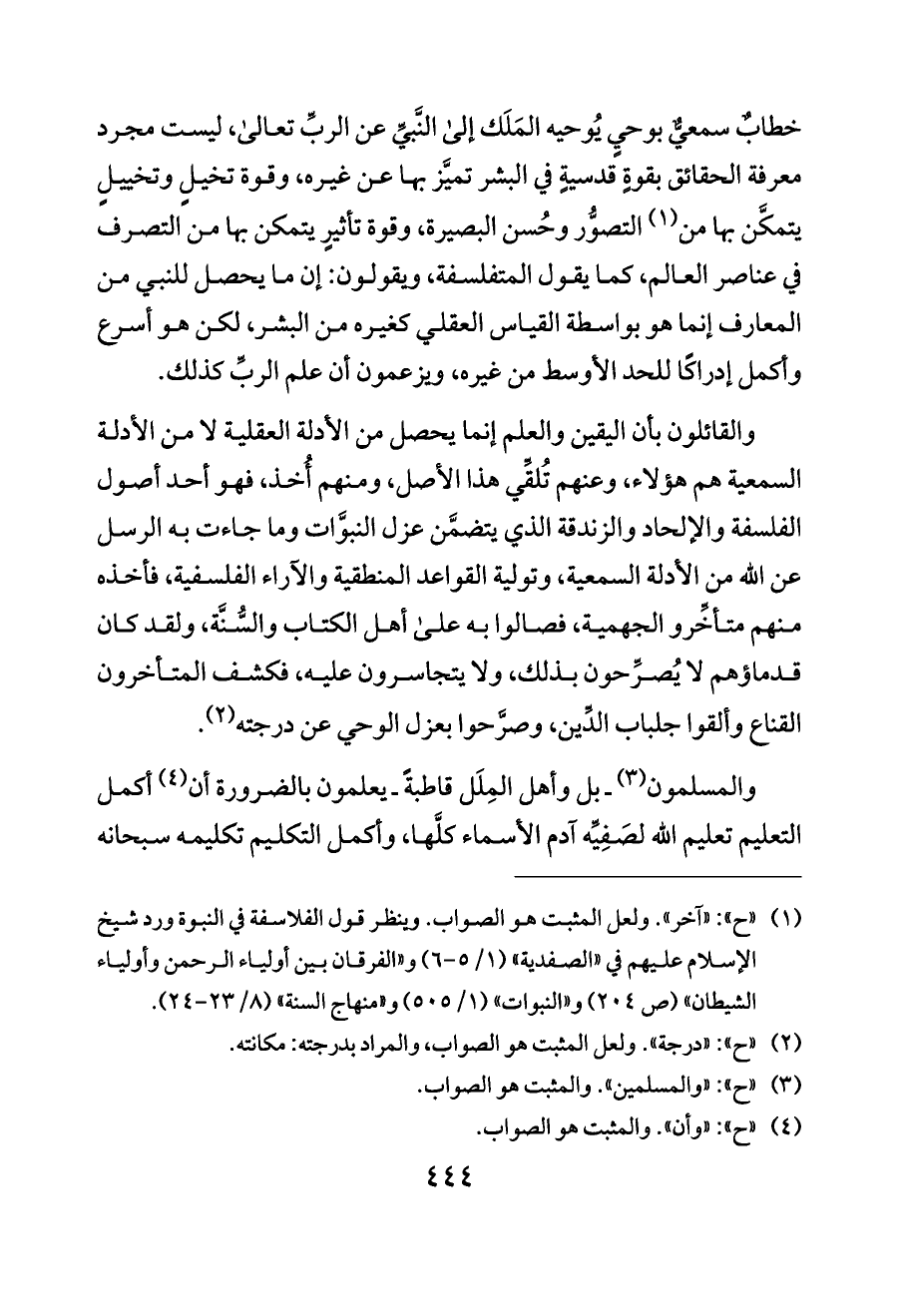 خطابٌ سمعيٌّ بوحيٍ يُوحيه المَلَك إلى النَّبيِّ عن الربِّ تعالى، ليست مجرد معرفة الحقائق بقوةٍ قدسيةٍ في البشر تميَّز بها عن غيره، وقوة تخيلٍ وتخييلٍ يتمكَّن بها من (¬١) التصوُّر وحُسن البصيرة، وقوة تأثيرٍ يتمكن بها من التصرف في عناصر العالم، كما يقول المتفلسفة، ويقولون: إن ما يحصل للنبي من المعارف إنما هو بواسطة القياس العقلي كغيره من البشر، لكن هو أسرع وأكمل إدراكًا للحد الأوسط من غيره، ويزعمون أن علم الربِّ كذلك.