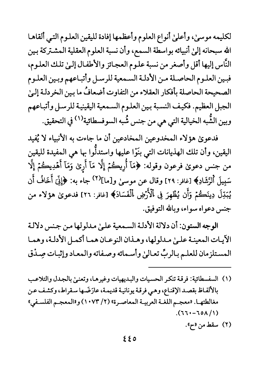 (¬١) السفسطائية: فرقة تنكر الحسيات والبديهيات وغيرها، وتعنى بالجدل والتلاعب بالألفاظ بقصد الإقناع، وهي فرقة يونانية قديمة، عارَضَها سقراط، وكشف عن مغالطتها. «معجم اللغة العربية المعاصرة» (٢/ ١٠٧٣) و «المعجم الفلسفي» (١/ ٦٥٨ - ٦٦٠).