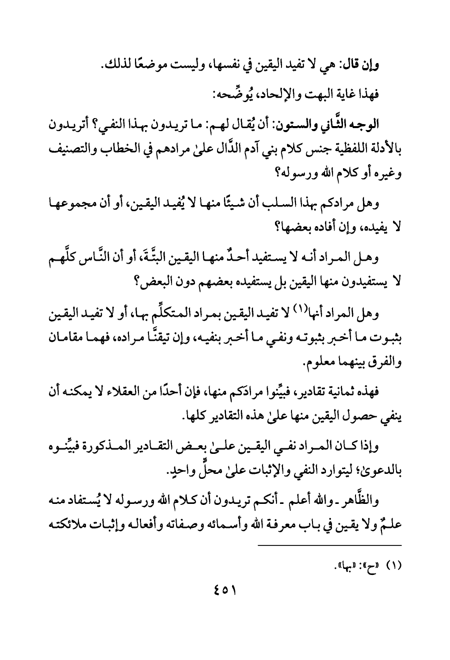والظَّاهر ـ والله أعلم ـ أنكم تريدون أن كلام الله ورسوله لا يُستفاد منه علمٌ ولا يقين في باب معرفة الله وأسمائه وصفاته وأفعاله وإثبات ملائكته
