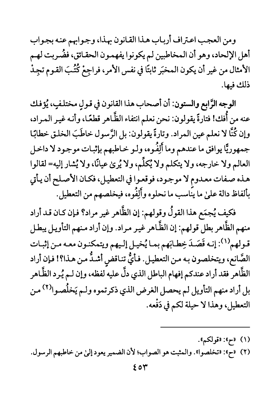 الوجه الرَّابع والستون: أن أصحاب هذا القانون في قولٍ مختلفٍ، يُؤفك عنه من أُفك! فتارةً يقولون: نحن نعلم انتفاء الظَّاهر قطعًا، وأنه غير المراد، وإن كُنَّا لا نعلم عين المراد. وتارةً يقولون: بل الرَّسول خاطَبَ الخلق خطابًا جمهوريًّا يوافق ما عندهم وما أَلِفُوه، ولو خاطبهم بإثبات موجود لا داخل العالم ولا خارجه، ولا يتكلم ولا يُكلِّم، ولا يُرى عيانًا، ولا يُشار إليه= لقالوا هذه صفات معدومٍ لا موجود، فوقعوا في التعطيل، فكان الأصلح أن يأتي بألفاظ دالة على ما يناسب ما نحلوه وأَلِفُوه، فيخلصهم من التعطيل.