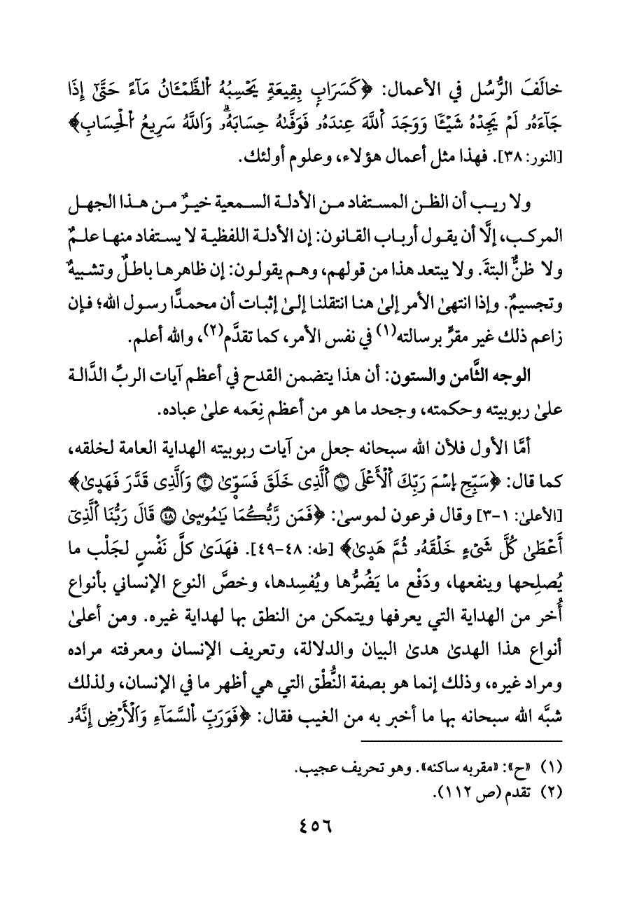 ولا ريب أن الظن المستفاد من الأدلة السمعية خيرٌ من هذا الجهل المركب، إلَّا أن يقول أرباب القانون: إن الأدلة اللفظية لا يستفاد منها علمٌ ولا ظنٌّ البتةَ. ولا يبتعد هذا من قولهم، وهم يقولون: إن ظاهرها باطلٌ وتشبيهٌ وتجسيمٌ. وإذا انتهى الأمر إلى هنا انتقلنا إلى إثبات أن محمدًّا رسول الله؛ فإن زاعم ذلك غير مقرٍّ برسالته (¬١) في نفس الأمر، كما تقدَّم (¬٢)، والله أعلم.