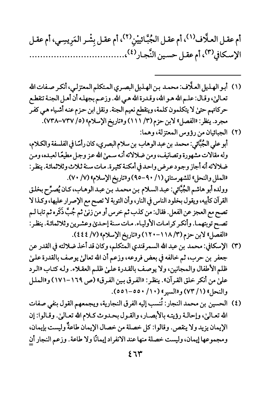 (¬١) أبو الهذيل العلَّاف: محمد بن الهذيل البصري المتكلم المعتزلي، أنكر صفات الله تعالى، وقال: علم الله هو الله، وقدرة الله هي الله. وزعم بجهله أن أهل الجنة تنقطع حركاتهم حتى لا يتكلمون كلمة، وينقطع نعيم الجنة. ونقل ابن حزم عنه أشياء هي كفر مجرد. ينظر: «الفصل» لابن حزم (٣/ ١١١) و «تاريخ الإسلام» (٥/ ٧٣٧ - ٧٣٨).