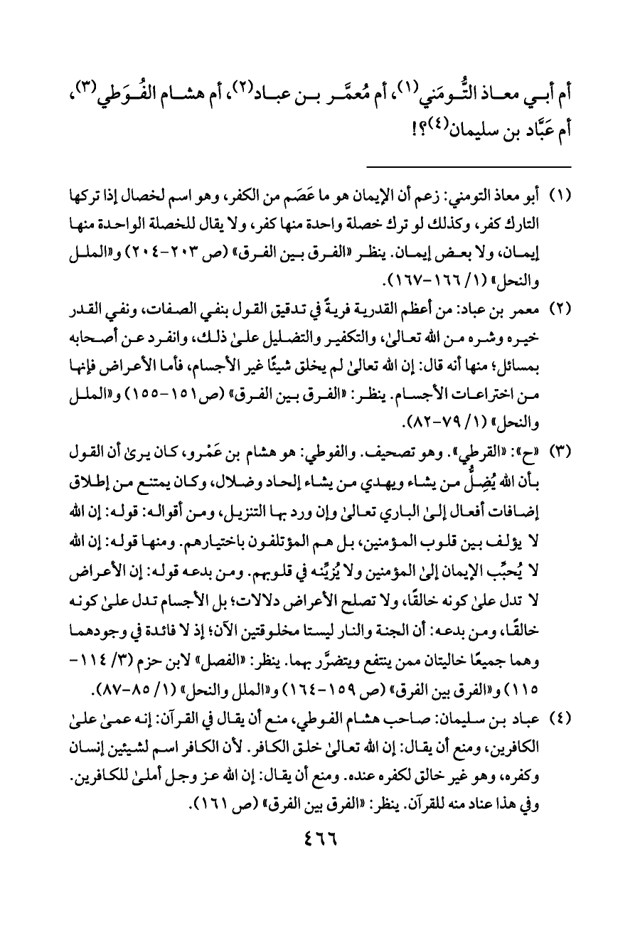 (¬٣) «ح»: «القرطي». وهو تصحيف. والفوطي: هو هشام بن عَمْرو، كان يرى أن القول بأن الله يُضِلُّ من يشاء ويهدي من يشاء إلحاد وضلال، وكان يمتنع من إطلاق إضافات أفعال إلى الباري تعالى وإن ورد بها التنزيل، ومن أقواله: قوله: إن الله لا يؤلف بين قلوب المؤمنين، بل هم المؤتلفون باختيارهم. ومنها قوله: إن الله لا يُحبِّب الإيمان إلى المؤمنين ولا يُزيِّنه في قلوبهم. ومن بدعه قوله: إن الأعراض لا تدل على كونه خالقًا، ولا تصلح الأعراض دلالات؛ بل الأجسام تدل على كونه خالقًا، ومن بدعه: أن الجنة والنار ليستا مخلوقتين الآن؛ إذ لا فائدة في وجودهما وهما جميعًا خاليتان ممن ينتفع ويتضرَّر بهما. ينظر: «الفصل» لابن حزم (٣/ ١١٤ - ١١٥) و «الفرق بين الفرق» (ص ١٥٩ - ١٦٤) و «الملل والنحل» (١/ ٨٥ - ٨٧).