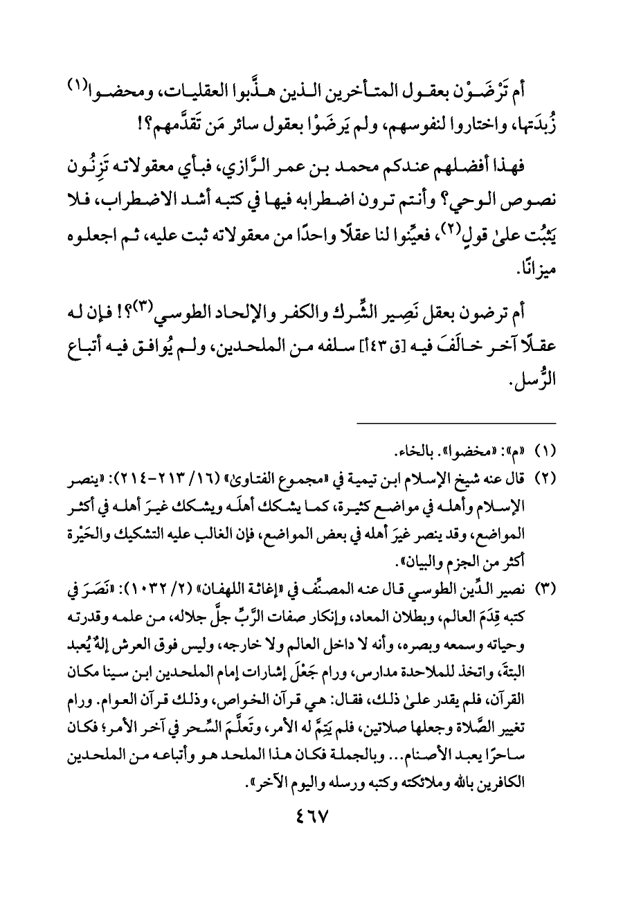 (¬٣) نصير الدِّين الطوسي قال عنه المصنِّف في «إغاثة اللهفان» (٢/ ١٠٣٢): «نَصَرَ في كتبه قِدَمَ العالم، وبطلان المعاد، وإنكار صفات الرَّبِّ جلَّ جلاله، من علمه وقدرته وحياته وسمعه وبصره، وأنه لا داخل العالم ولا خارجه، وليس فوق العرش إلهٌ يُعبد البتةَ، واتخذ للملاحدة مدارس، ورام جَعْلَ إشارات إمام الملحدين ابن سينا مكان القرآن، فلم يقدر على ذلك، فقال: هي قرآن الخواص، وذلك قرآن العوام. ورام تغيير الصَّلاة وجعلها صلاتين، فلم يَتِمَّ له الأمر، وتَعلَّمَ السِّحر في آخر الأمر؛ فكان ساحرًا يعبد الأصنام ... وبالجملة فكان هذا الملحد هو وأتباعه من الملحدين الكافرين بالله وملائكته وكتبه ورسله واليوم الآخر».