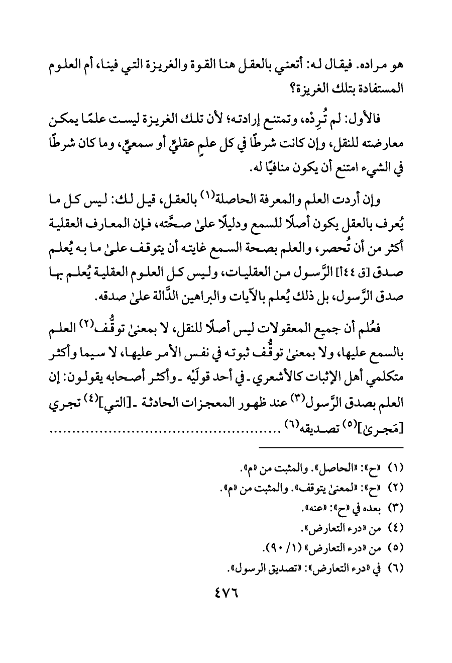 فعُلم أن جميع المعقولات ليس أصلًا للنقل، لا بمعنى توقُّف (¬٢) العلم بالسمع عليها، ولا بمعنى توقُّف ثبوته في نفس الأمر عليها، لا سيما وأكثر متكلمي أهل الإثبات كالأشعري ـ في أحد قولَيْه ـ وأكثر أصحابه يقولون: إن العلم بصدق الرَّسول (¬٣) عند ظهور المعجزات الحادثة ـ [التي] (¬٤) تجري [مَجرى] (¬٥) تصديقه (¬٦) ...................................................