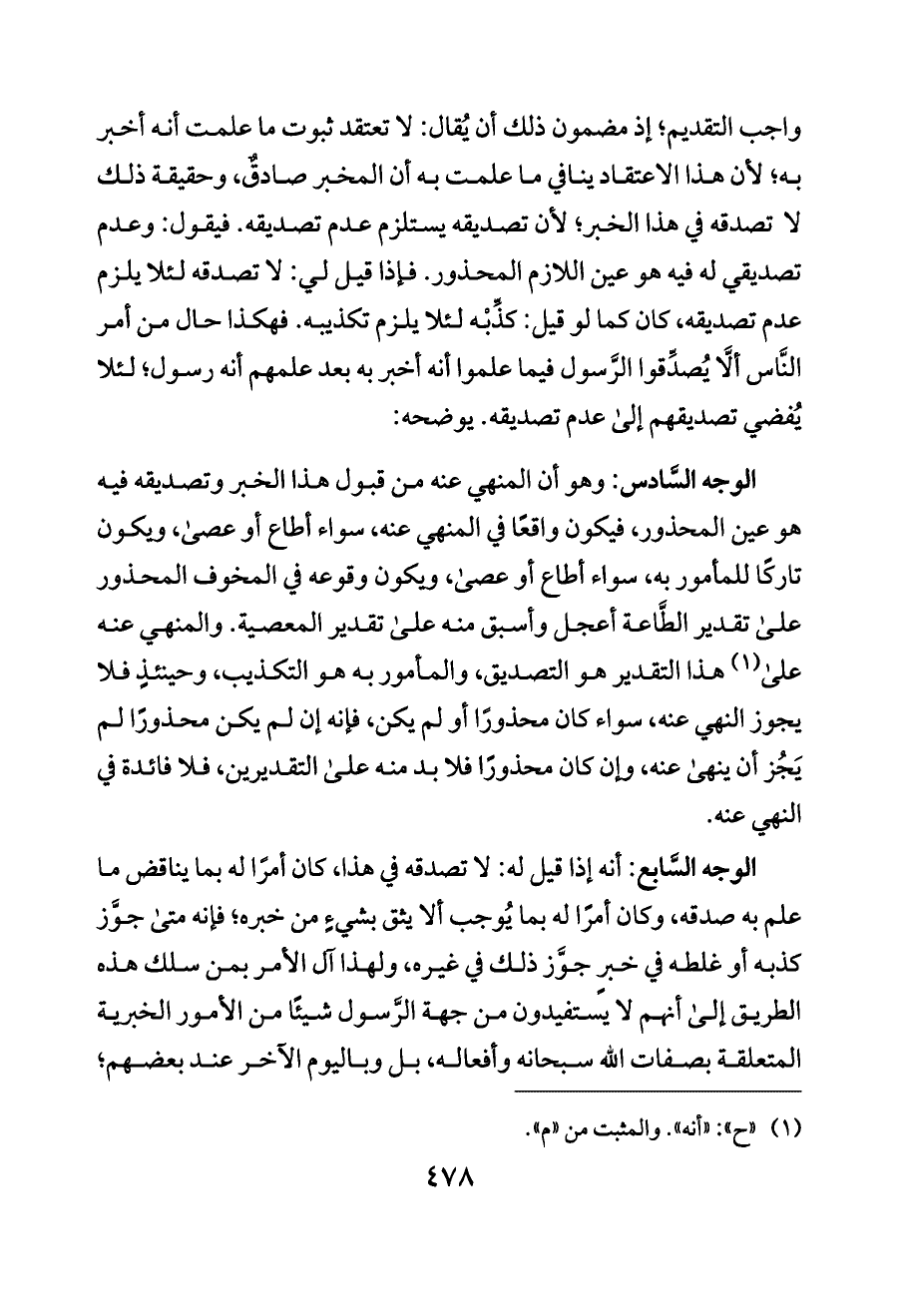 واجب التقديم؛ إذ مضمون ذلك أن يُقال: لا تعتقد ثبوت ما علمت أنه أخبر به؛ لأن هذا الاعتقاد ينافي ما علمت به أن المخبر صادقٌ، وحقيقة ذلك لا تصدقه في هذا الخبر؛ لأن تصديقه يستلزم عدم تصديقه. فيقول: وعدم تصديقي له فيه هو عين اللازم المحذور. فإذا قيل لي: لا تصدقه لئلا يلزم عدم تصديقه، كان كما لو قيل: كذِّبْه لئلا يلزم تكذيبه. فهكذا حال من أمر النَّاس ألَّا يُصدِّقوا الرَّسول فيما علموا أنه أخبر به بعد علمهم أنه رسول؛ لئلا يُفضي تصديقهم إلى عدم تصديقه. يوضحه: