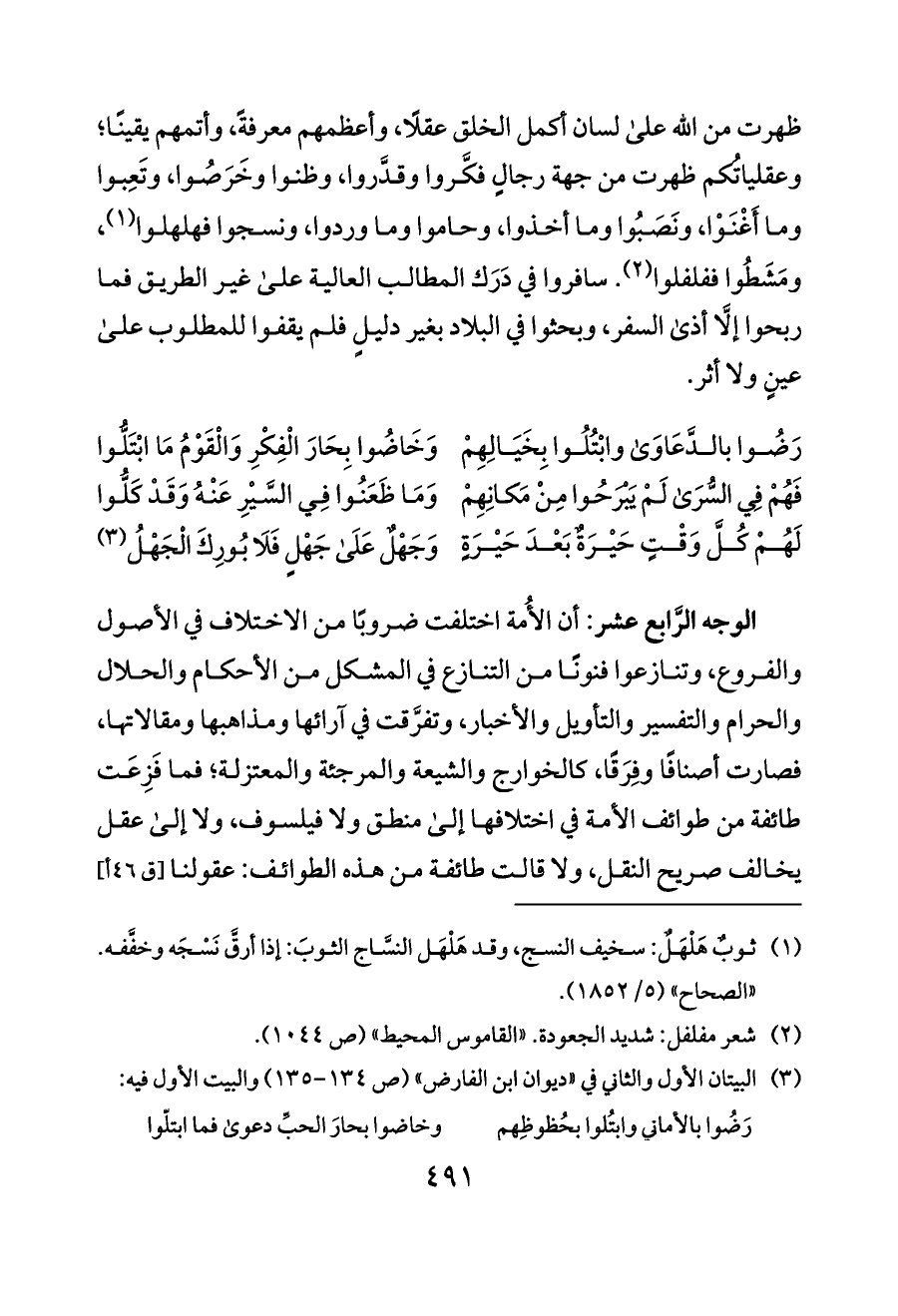 الوجه الرَّابع عشر: أن الأُمة اختلفت ضروبًا من الاختلاف في الأصول والفروع، وتنازعوا فنونًا من التنازع في المشكل من الأحكام والحلال والحرام والتفسير والتأويل والأخبار، وتفرَّقت في آرائها ومذاهبها ومقالاتها، فصارت أصنافًا وفِرَقًا، كالخوارج والشيعة والمرجئة والمعتزلة؛ فما فَزِعَت طائفة من طوائف الأمة في اختلافها إلى منطق ولا فيلسوف، ولا إلى عقل يخالف صريح النقل، ولا قالت طائفة من هذه الطوائف: عقولنا [ق ٤٦ أ]