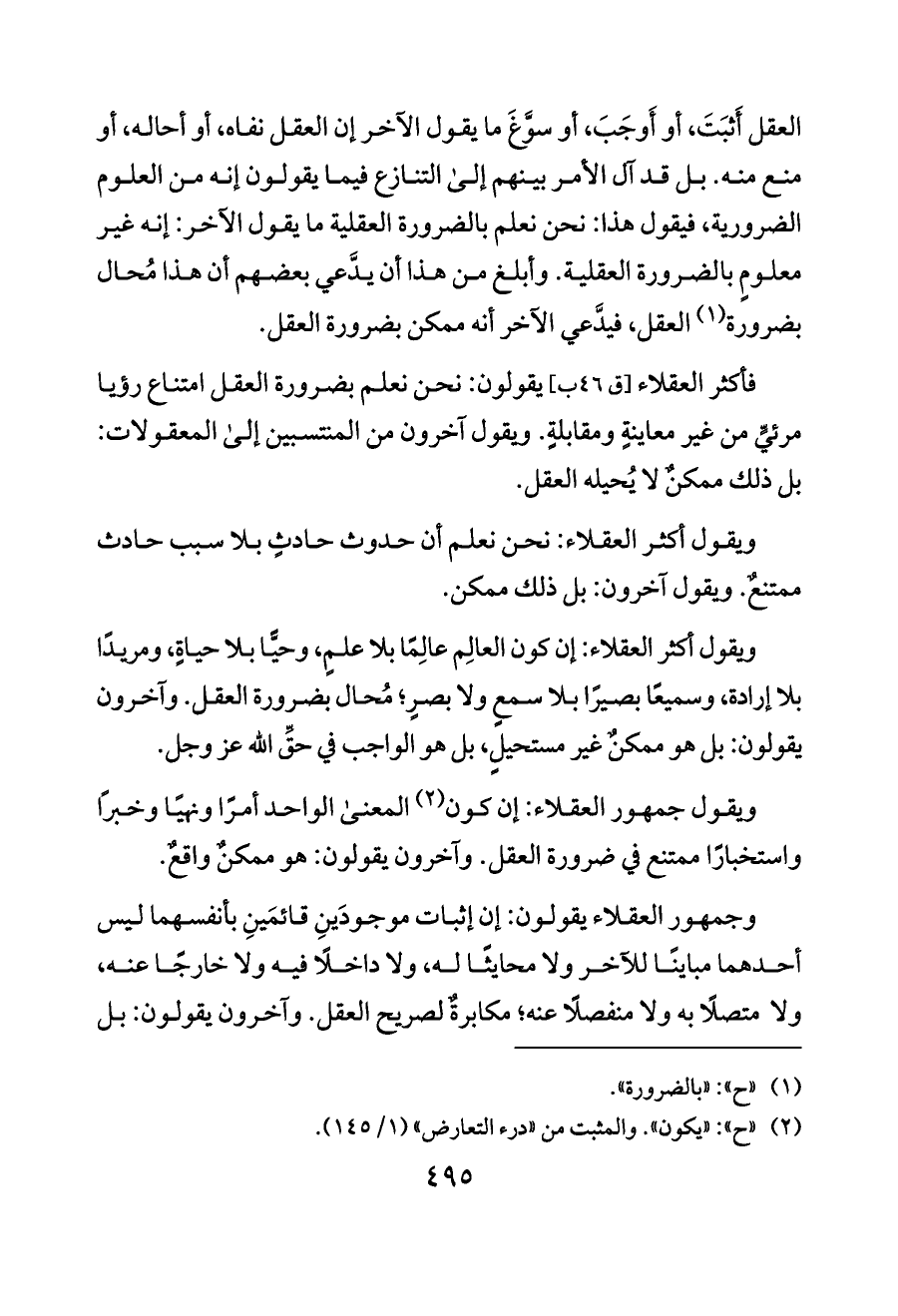 فأكثر العقلاء [ق ٤٦ ب] يقولون: نحن نعلم بضرورة العقل امتناع رؤيا مرئيٍّ من غير معاينةٍ ومقابلةٍ. ويقول آخرون من المنتسبين إلى المعقولات: بل ذلك ممكنٌ لا يُحيله العقل.