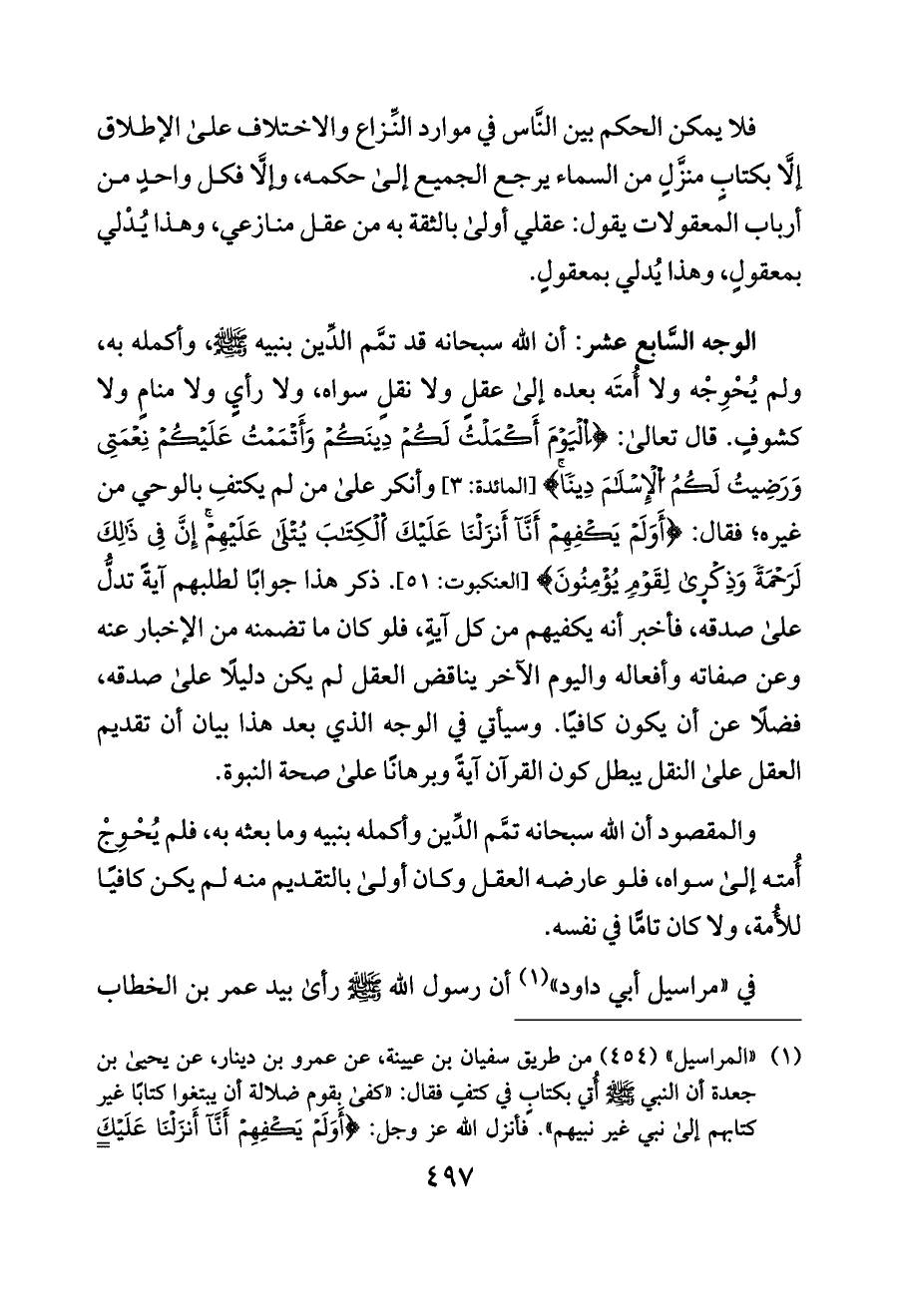 الوجه السَّابع عشر: أن الله سبحانه قد تمَّم الدِّين بنبيه - صلى الله عليه وسلم -، وأكمله به، ولم يُحْوِجْه ولا أُمتَه بعده إلى عقلٍ ولا نقلٍ سواه، ولا رأيٍ ولا منامٍ ولا كشوفٍ. قال تعالى: {اِلْيَوْمَ أَكْمَلْتُ لَكُمْ دِينَكُمْ وَأَتْمَمْتُ عَلَيْكُمْ نِعْمَتِي وَرَضِيتُ لَكُمُ اُلْإِسْلَامَ دِينًا} [المائدة: ٣] وأنكر على من لم يكتفِ بالوحي من غيره؛ فقال: {أَوَلَمْ يَكْفِهِمْ أَنَّا أَنزَلْنَا عَلَيْكَ اَلْكِتَابَ يُتْلَى عَلَيْهِمْ إِنَّ فِي ذَلِكَ لَرَحْمَةً وَذِكْرى لِقَوْمٍ يُؤْمِنُونَ} [العنكبوت: ٥١]. ذكر هذا جوابًا لطلبهم آيةً تدلُّ على صدقه، فأخبر أنه يكفيهم من كل آيةٍ، فلو كان ما تضمنه من الإخبار عنه وعن صفاته وأفعاله واليوم الآخر يناقض العقل لم يكن دليلًا على صدقه، فضلًا عن أن يكون كافيًا. وسيأتي في الوجه الذي بعد هذا بيان أن تقديم العقل على النقل يبطل كون القرآن آيةً وبرهانًا على صحة النبوة.