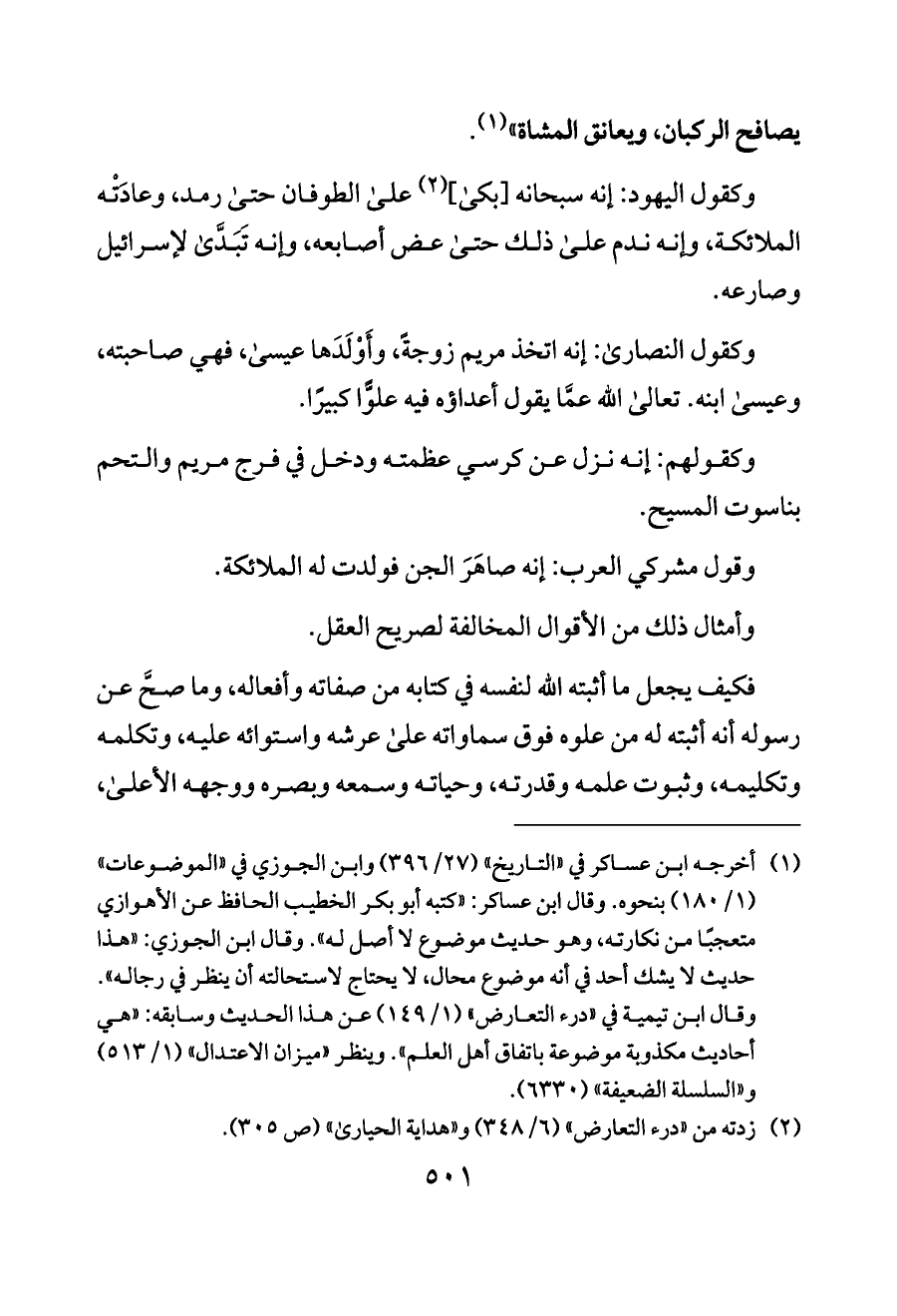 وكقول اليهود: إنه سبحانه [بكى] (¬٢) على الطوفان حتى رمد، وعادَتْه الملائكة، وإنه ندم على ذلك حتى عض أصابعه، وإنه تَبَدَّى لإسرائيل وصارعه.