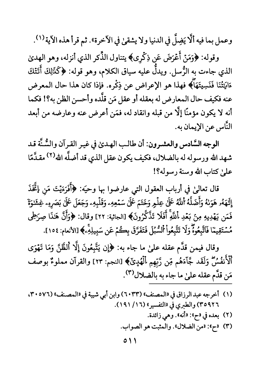 وقال فيمن قدَّم عقله على ما جاء به: {إِن يَتَّبِعُونَ إِلَّا اَلظَّنَّ وَمَا تَهْوَى اَلْأَنفُسُ وَلَقَد جَّاءَهُم مِّن رَّبِّهِمِ اِلْهُدى} [النجم: ٢٣] والقرآن مملوءٌ بوصف مَن قدَّم عقله على ما جاء به بالضلال (¬٣).