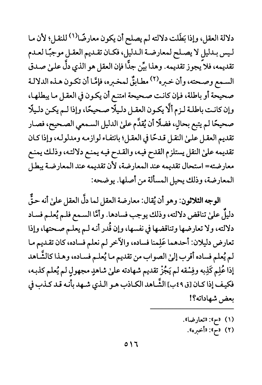 الوجه الثلاثون: وهو أن يُقال: معارضة العقل لما دلَّ العقل على أنه حقٌّ دليلٌ على تناقض دلالته، وذلك يوجب فسادها. وأمَّا السمع فلم يُعلم فساد دلالته، ولا تعارضها وتناقضها في نفسها، وإن قُدر أنه لم يعلم صحتها، وإذا تعارض دليلان: أحدهما عَلِمنا فساده، والآخر لم نعلم فساده، كان تقديم ما لم يُعلم فساده أقرب إلى الصواب من تقديم ما يُعلم فساده، وهذا كالشَّاهد إذا عُلِم كَذِبه وفِسْقه لم يَجُزْ تقديم شهادته على شاهدٍ مجهولٍ لم يُعلم كذبه، فكيف إذا كان [ق ٤٩ ب] الشَّاهد الكاذب هو الذي شهد بأنه قد كذب في بعض شهاداته؟!
