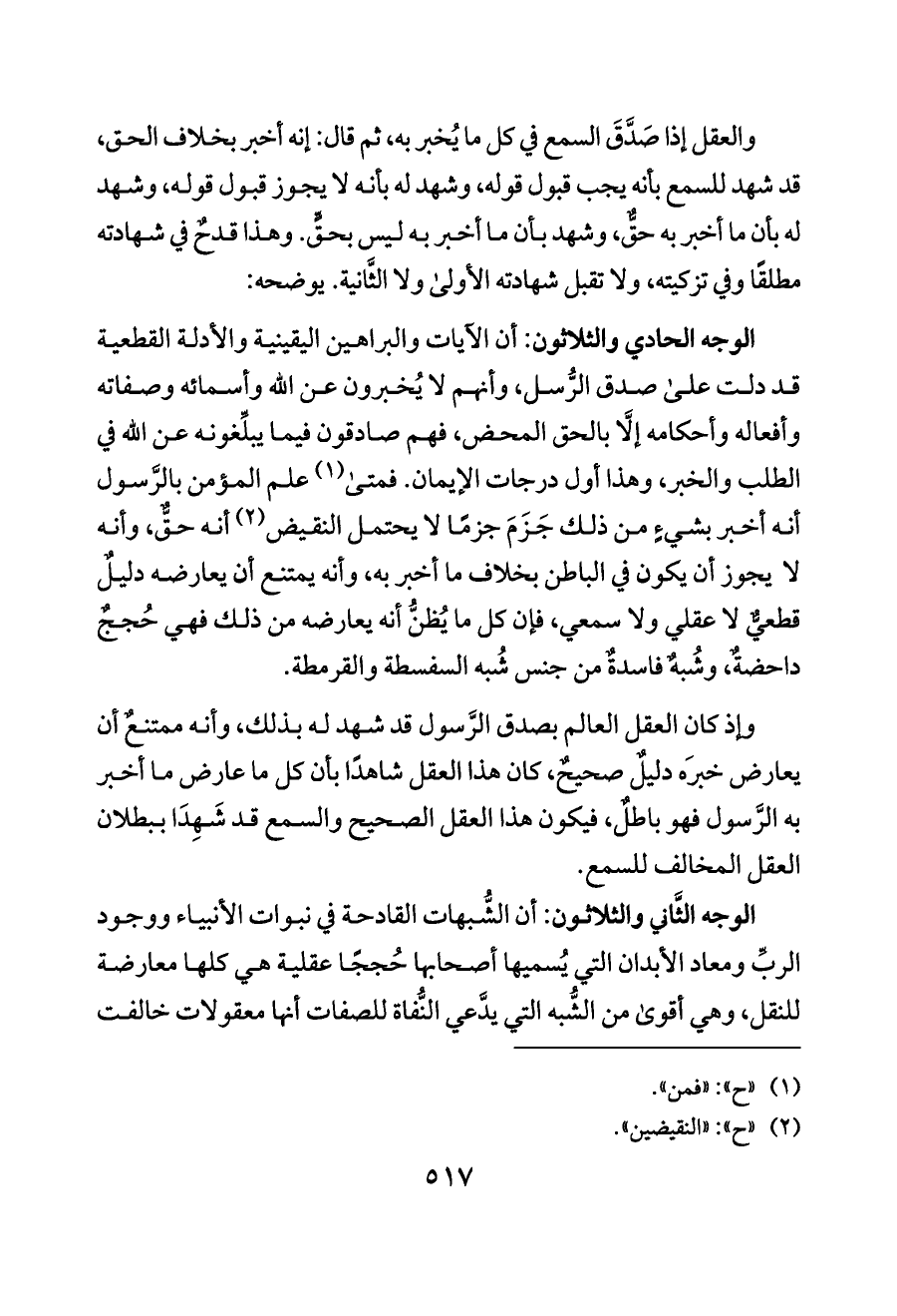 الوجه الثَّاني والثلاثون: أن الشُّبهات القادحة في نبوات الأنبياء ووجود الربِّ ومعاد الأبدان التي يُسميها أصحابها حُججًا عقلية هي كلها معارضة للنقل، وهي أقوى من الشُّبه التي يدَّعي النُّفاة للصفات أنها معقولات خالفت