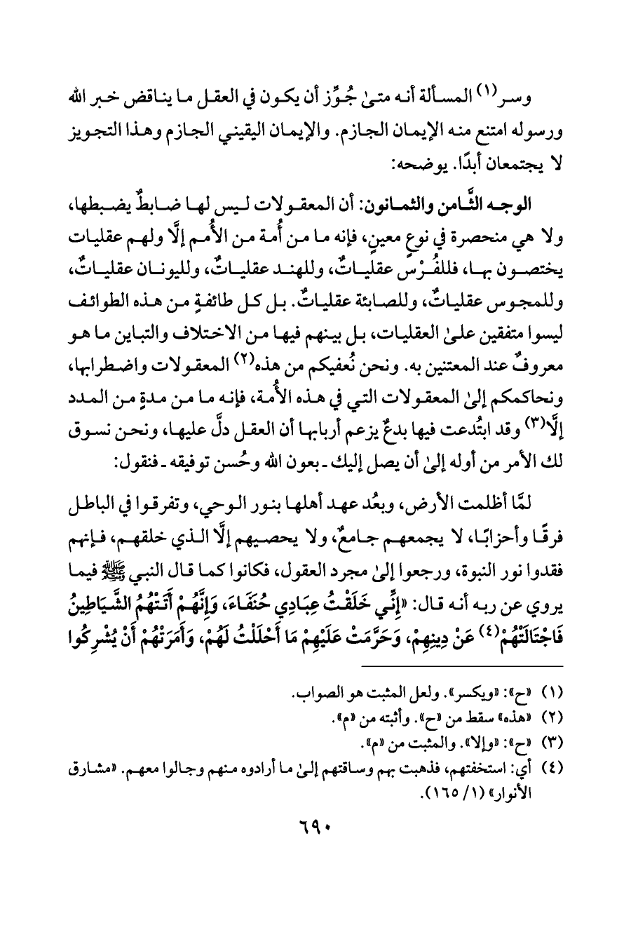 الوجه الثَّامن والثمانون: أن المعقولات ليس لها ضابطٌ يضبطها، ولا هي منحصرة في نوعٍ معينٍ، فإنه ما من أُمة من الأُمم إلَّا ولهم عقليات يختصون بها، فللفُرْس عقلياتٌ، وللهند عقلياتٌ، ولليونان عقلياتٌ، وللمجوس عقلياتٌ، وللصابئة عقلياتٌ. بل كل طائفةٍ من هذه الطوائف ليسوا متفقين على العقليات، بل بينهم فيها من الاختلاف والتباين ما هو معروفٌ عند المعتنين به. ونحن نُعفيكم من هذه (¬٢) المعقولات واضطرابها، ونحاكمكم إلى المعقولات التي في هذه الأُمة، فإنه ما من مدةٍ من المدد إلَّا (¬٣) وقد ابتُدعت فيها بدعٌ يزعم أربابها أن العقل دلَّ عليها، ونحن نسوق لك الأمر من أوله إلى أن يصل إليك ـ بعون الله وحُسن توفيقه ـ فنقول: