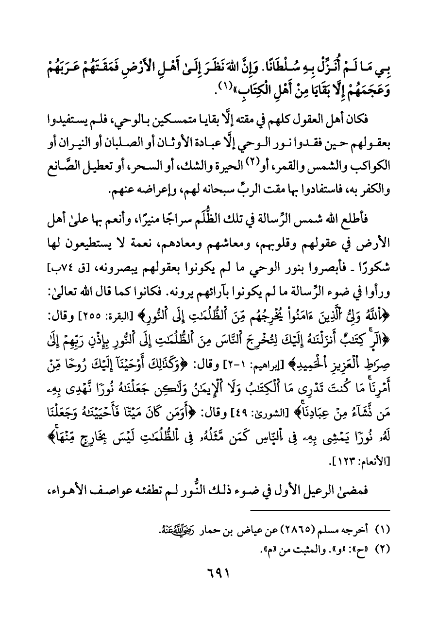 فأطلع الله شمس الرِّسالة في تلك الظُّلَم سراجًا منيرًا، وأنعم بها على أهل الأرض في عقولهم وقلوبهم، ومعاشهم ومعادهم، نعمة لا يستطيعون لها شكورًا ـ فأبصروا بنور الوحي ما لم يكونوا بعقولهم يبصرونه، [ق ٧٤ ب] ورأوا في ضوء الرِّسالة ما لم يكونوا بآرائهم يرونه. فكانوا كما قال الله تعالى: {اِللَّهُ وَلِيُّ اُلَّذِينَ آمَنُوا يُخْرِجُهُم مِّنَ اَلظُّلُمَاتِ إِلَى اَلنُّورِ} [البقرة: ٢٥٥] وقال: {الر كِتَابٌ أَنزَلْنَاهُ إِلَيْكَ لِتُخْرِجَ اَلنَّاسَ مِنَ اَلظُّلُمَاتِ إِلَى اَلنُّورِ بِإِذْنِ رَبِّهِمْ إِلَى صِرَاطِ اِلْعَزِيزِ اِلْحَمِيدِ} [إبراهيم: ١ - ٢] وقال: {وَكَذَلِكَ أَوْحَيْنَا إِلَيْكَ رُوحًا مِّنْ أَمْرِنَا مَا كُنتَ تَدْرِي مَا اَلْكِتَابُ وَلَا اَلْإِيمَانُ وَلَكِن جَعَلْنَاهُ نُورًا نَّهْدِي بِهِ مَن نَّشَاءُ مِنْ عِبَادِنَا} [الشورى: ٤٩] وقال: {أَوَمَن كَانَ مَيْتًا فَأَحْيَيْنَاهُ وَجَعَلْنَا لَهُ نُورًا يَمْشِي بِهِ فِي اِلنَّاسِ كَمَن مَّثَلُهُ فِي اِلظُّلُمَاتِ لَيْسَ بِخَارِجٍ مِّنْهَا} [الأنعام: ١٢٣].