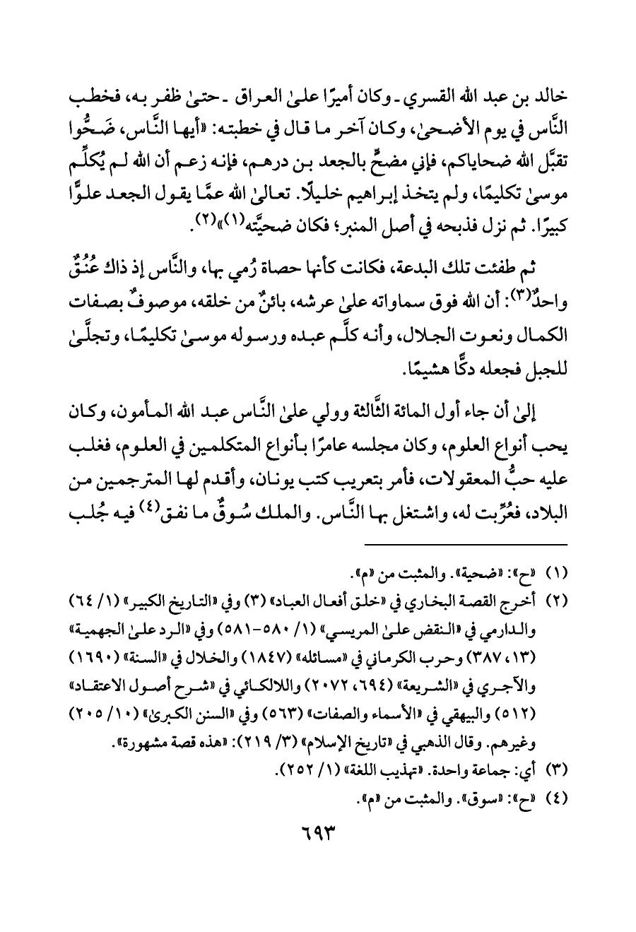 خالد بن عبد الله القسري ـ وكان أميرًا على العراق ـ حتى ظفر به، فخطب النَّاس في يوم الأضحى، وكان آخر ما قال في خطبته: «أيها النَّاس، ضَحُّوا تقبَّل الله ضحاياكم، فإني مضحٍّ بالجعد بن درهم، فإنه زعم أن الله لم يُكلِّم موسى تكليمًا، ولم يتخذ إبراهيم خليلًا. تعالى الله عمَّا يقول الجعد علوًّا كبيرًا. ثم نزل فذبحه في أصل المنبر؛ فكان ضحيَّته (¬١)» (¬٢).