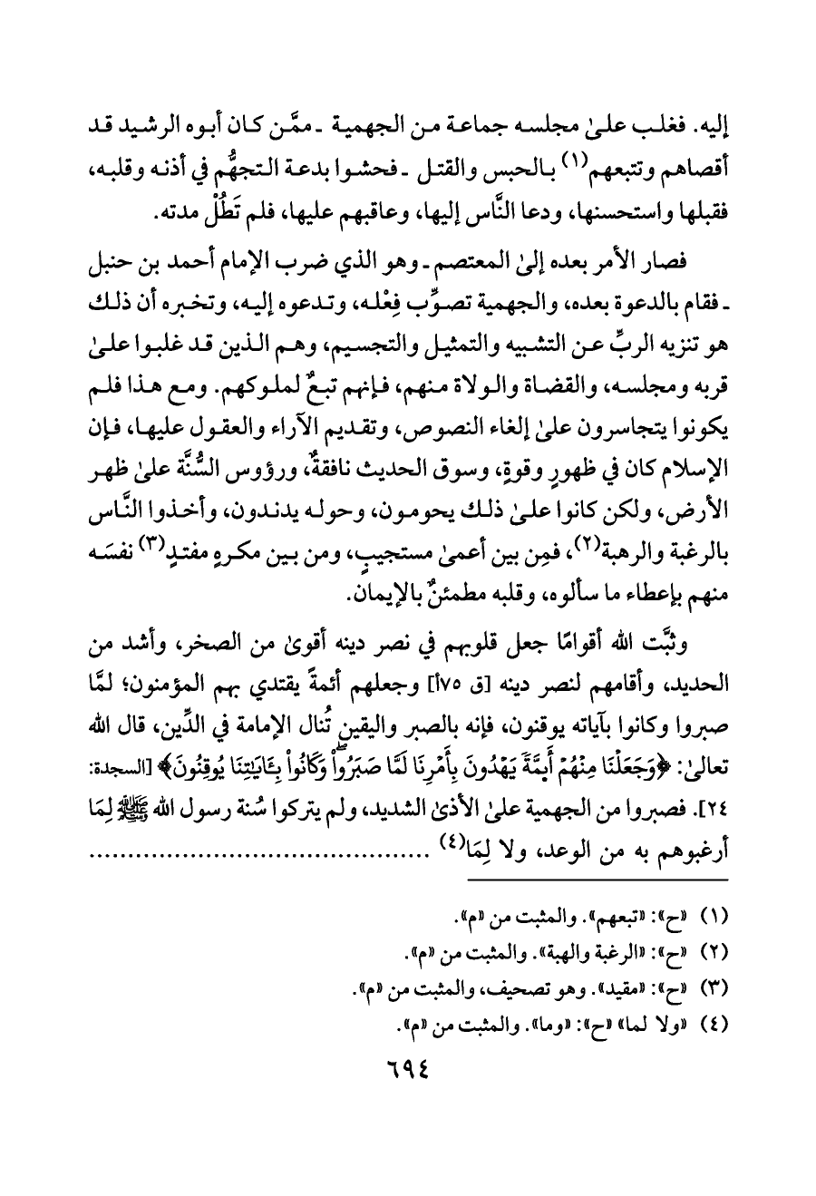 وثبَّت الله أقوامًا جعل قلوبهم في نصر دينه أقوى من الصخر، وأشد من الحديد، وأقامهم لنصر دينه [ق ٧٥ أ] وجعلهم أئمةً يقتدي بهم المؤمنون؛ لمَّا صبروا وكانوا بآياته يوقنون، فإنه بالصبر واليقين تُنال الإمامة في الدِّين، قال الله تعالى: {وَجَعَلْنَا مِنْهُمْ أَىمَّةً يَهْدُونَ بِأَمْرِنَا لَمَّا صَبَرُوا وَكَانُوا بِآيَاتِنَا يُوقِنُونَ} [السجدة: ٢٤]. فصبروا من الجهمية على الأذى الشديد، ولم يتركوا سُنة رسول الله - صلى الله عليه وسلم - لِمَا أرغبوهم به من الوعد، ولا لِمَا (¬٤) ............................................