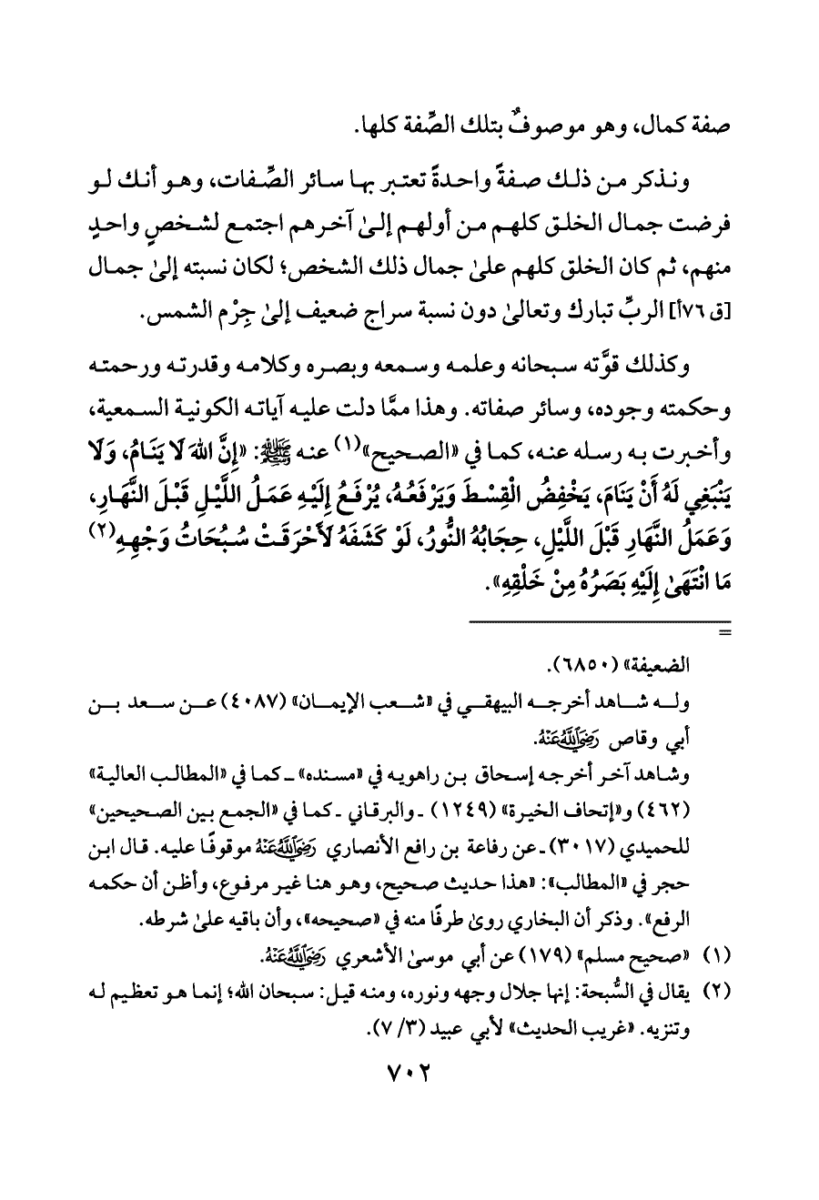 وكذلك قوَّته سبحانه وعلمه وسمعه وبصره وكلامه وقدرته ورحمته وحكمته وجوده، وسائر صفاته. وهذا ممَّا دلت عليه آياته الكونية السمعية، وأخبرت به رسله عنه، كما في «الصحيح» (¬١) عنه - صلى الله عليه وسلم -: «إِنَّ اللَّهَ لَا يَنَامُ، وَلَا يَنْبَغِي لَهُ أَنْ يَنَامَ، يَخْفِضُ الْقِسْطَ وَيَرْفَعُهُ، يُرْفَعُ إِلَيْهِ عَمَلُ اللَّيْلِ قَبْلَ النَّهَارِ، وَعَمَلُ النَّهَارِ قَبْلَ اللَّيْلِ، حِجَابُهُ النُّورُ، لَوْ كَشَفَهُ لَأَحْرَقَتْ سُبُحَاتُ وَجْهِهِ (¬٢) مَا انْتَهَى إِلَيْهِ بَصَرُهُ مِنْ خَلْقِهِ».
