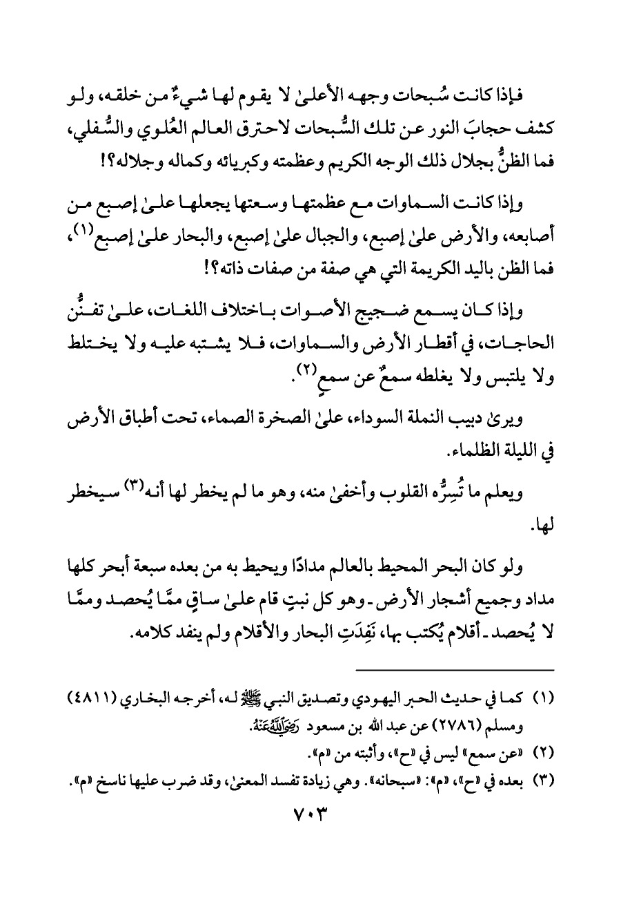 فإذا كانت سُبحات وجهه الأعلى لا يقوم لها شيءٌ من خلقه، ولو كشف حجابَ النور عن تلك السُّبحات لاحترق العالم العُلوي والسُّفلي، فما الظنُّ بجلال ذلك الوجه الكريم وعظمته وكبريائه وكماله وجلاله؟!