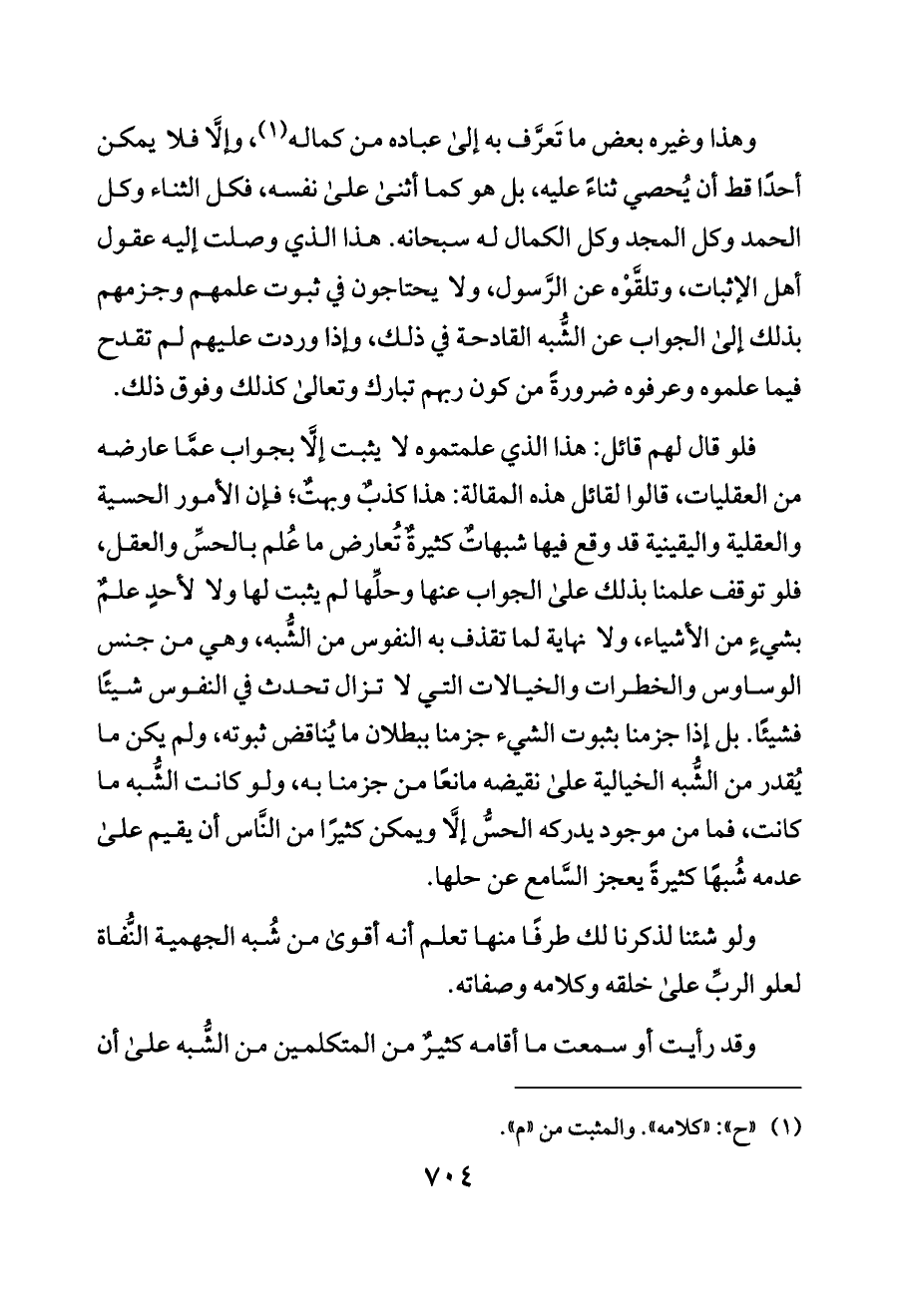 وهذا وغيره بعض ما تَعرَّف به إلى عباده من كماله (¬١)، وإلَّا فلا يمكن أحدًا قط أن يُحصي ثناءً عليه، بل هو كما أثنى على نفسه، فكل الثناء وكل الحمد وكل المجد وكل الكمال له سبحانه. هذا الذي وصلت إليه عقول أهل الإثبات، وتلقَّوْه عن الرَّسول، ولا يحتاجون في ثبوت علمهم وجزمهم بذلك إلى الجواب عن الشُّبه القادحة في ذلك، وإذا وردت عليهم لم تقدح فيما علموه وعرفوه ضرورةً من كون ربهم تبارك وتعالى كذلك وفوق ذلك.