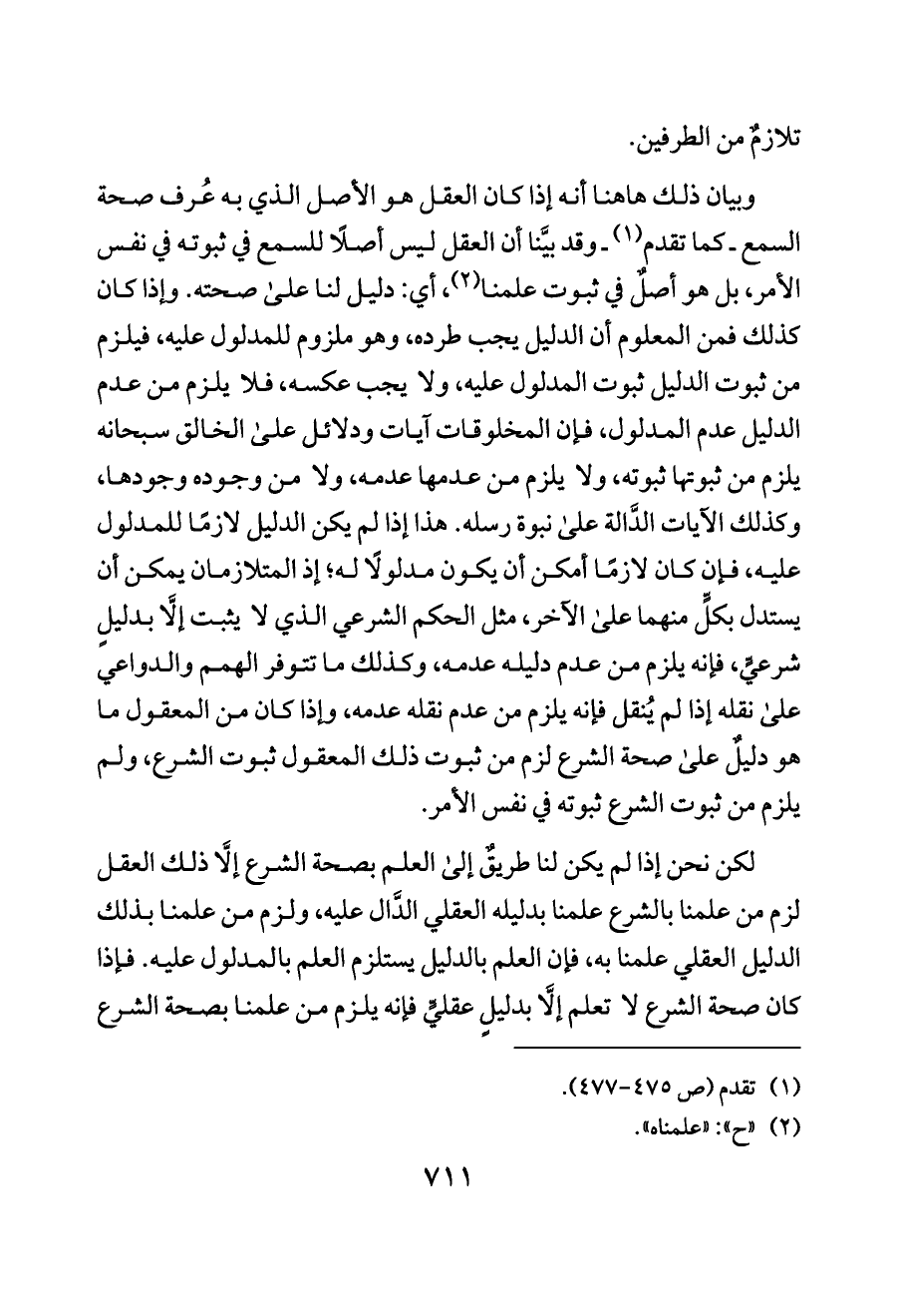 لكن نحن إذا لم يكن لنا طريقٌ إلى العلم بصحة الشرع إلَّا ذلك العقل لزم من علمنا بالشرع علمنا بدليله العقلي الدَّال عليه، ولزم من علمنا بذلك الدليل العقلي علمنا به، فإن العلم بالدليل يستلزم العلم بالمدلول عليه. فإذا كان صحة الشرع لا تعلم إلَّا بدليلٍ عقليٍّ فإنه يلزم من علمنا بصحة الشرع