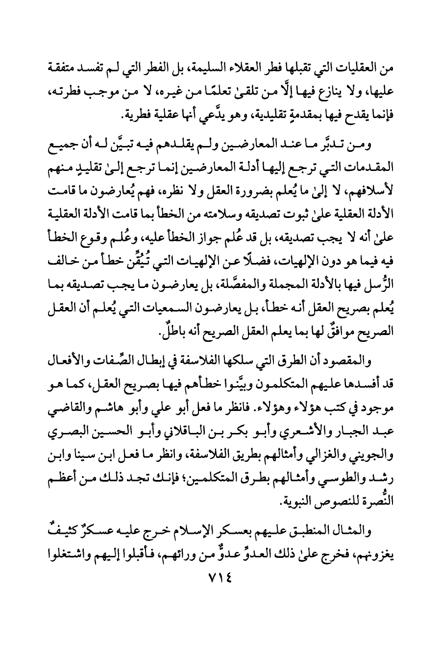 والمقصود أن الطرق التي سلكها الفلاسفة في إبطال الصِّفات والأفعال قد أفسدها عليهم المتكلمون وبيَّنوا خطأهم فيها بصريح العقل، كما هو موجود في كتب هؤلاء وهؤلاء. فانظر ما فعل أبو علي وأبو هاشم والقاضي عبد الجبار والأشعري وأبو بكر بن الباقلاني وأبو الحسين البصري والجويني والغزالي وأمثالهم بطريق الفلاسفة، وانظر ما فعل ابن سينا وابن رشد والطوسي وأمثالهم بطرق المتكلمين؛ فإنك تجد ذلك من أعظم النُّصرة للنصوص النبوية.