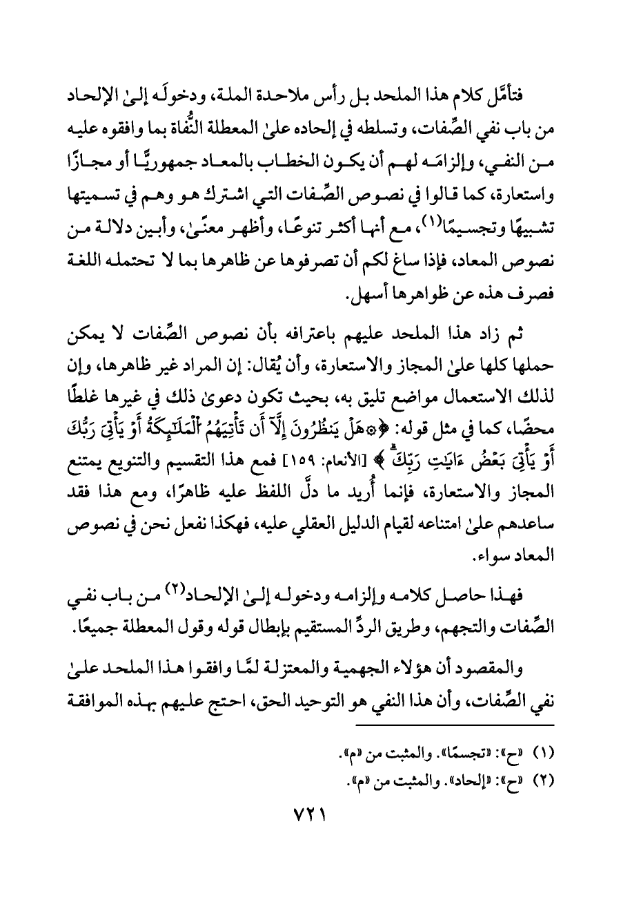 فهذا حاصل كلامه وإلزامه ودخوله إلى الإلحاد (¬٢) من باب نفي الصِّفات والتجهم، وطريق الردِّ المستقيم بإبطال قوله وقول المعطلة جميعًا.