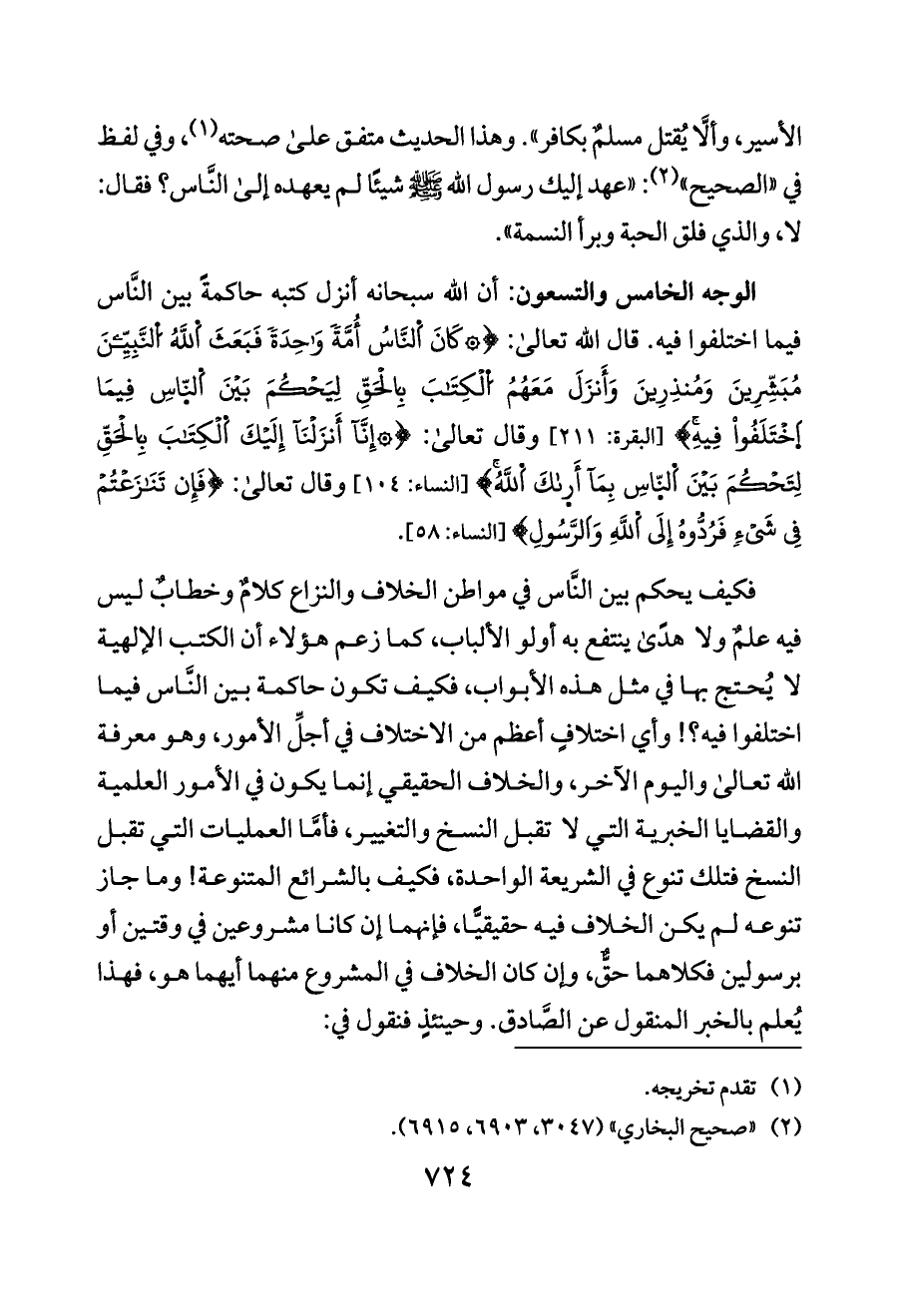فكيف يحكم بين النَّاس في مواطن الخلاف والنزاع كلامٌ وخطابٌ ليس فيه علمٌ ولا هدًى ينتفع به أولو الألباب، كما زعم هؤلاء أن الكتب الإلهية لا يُحتج بها في مثل هذه الأبواب، فكيف تكون حاكمة بين النَّاس فيما اختلفوا فيه؟! وأي اختلافٍ أعظم من الاختلاف في أجلِّ الأمور، وهو معرفة الله تعالى واليوم الآخر، والخلاف الحقيقي إنما يكون في الأمور العلمية والقضايا الخبرية التي لا تقبل النسخ والتغيير، فأمَّا العمليات التي تقبل النسخ فتلك تنوع في الشريعة الواحدة، فكيف بالشرائع المتنوعة! وما جاز تنوعه لم يكن الخلاف فيه حقيقيًّا، فإنهما إن كانا مشروعين في وقتين أو برسولين فكلاهما حقٌّ، وإن كان الخلاف في المشروع منهما أيهما هو، فهذا يُعلم بالخبر المنقول عن الصَّادق. وحينئذٍ فنقول في: